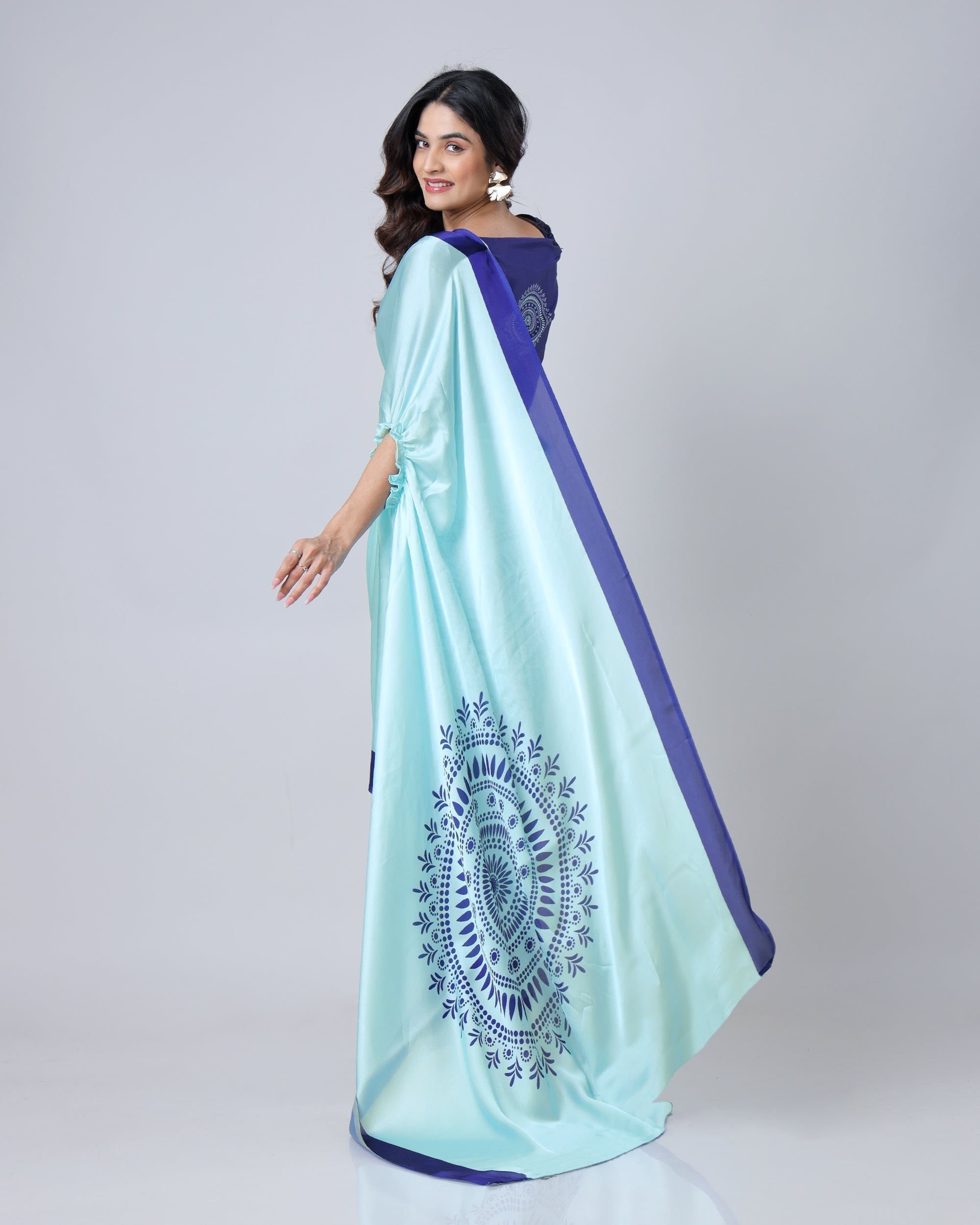 The saree showcases intricate hand-drawn mandala motifs in bold navy hues, set against a soft aqua base for a sophisticated contrast. Its sleek satin finish offers a gentle sheen that elevates your look, while the dual-tone border in rich blue adds a statement edge.