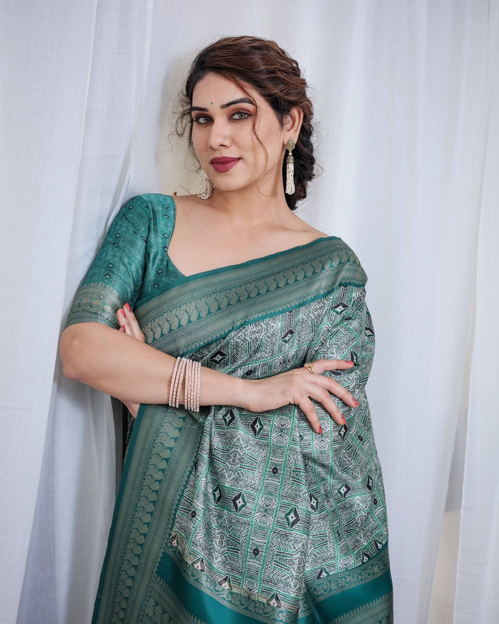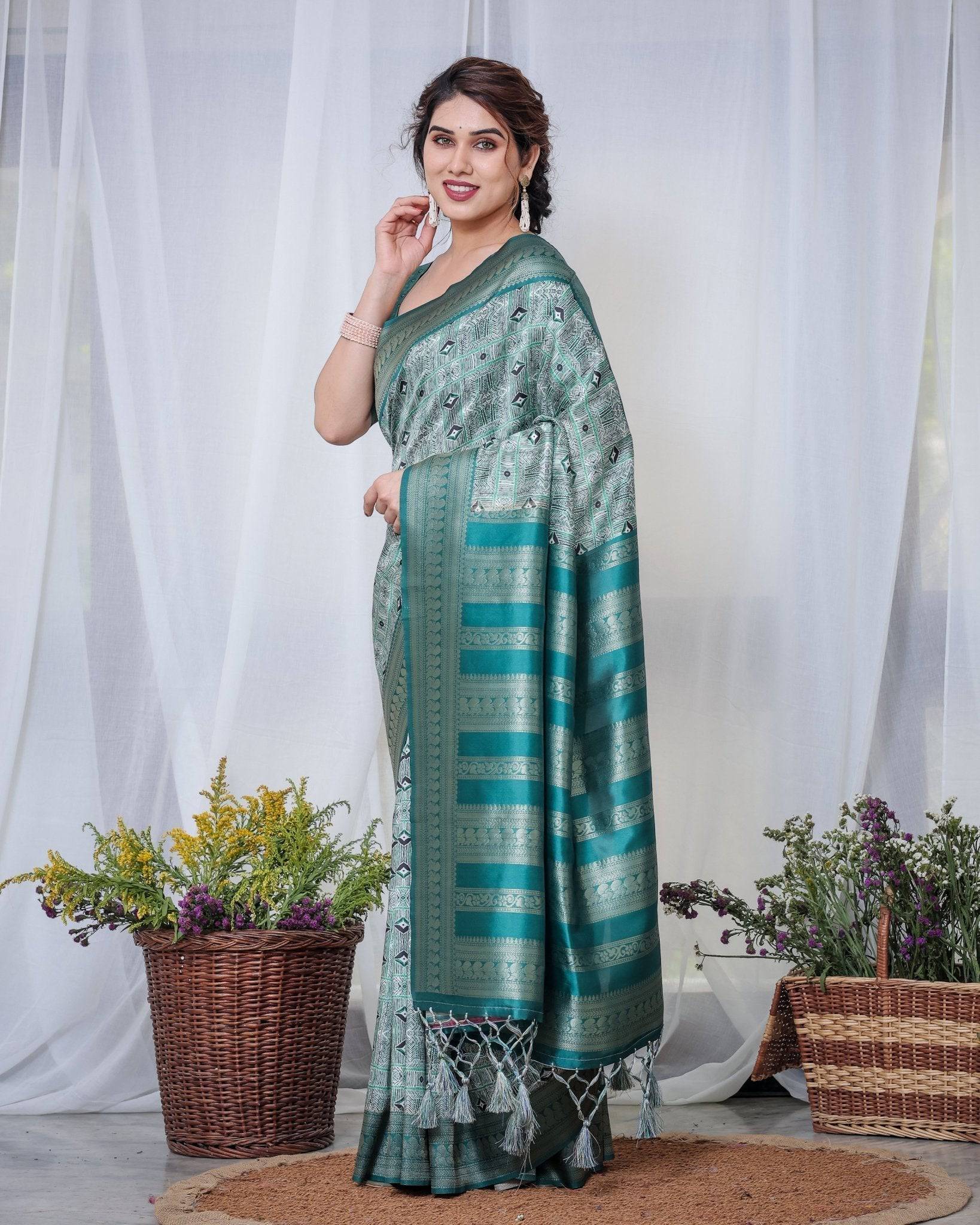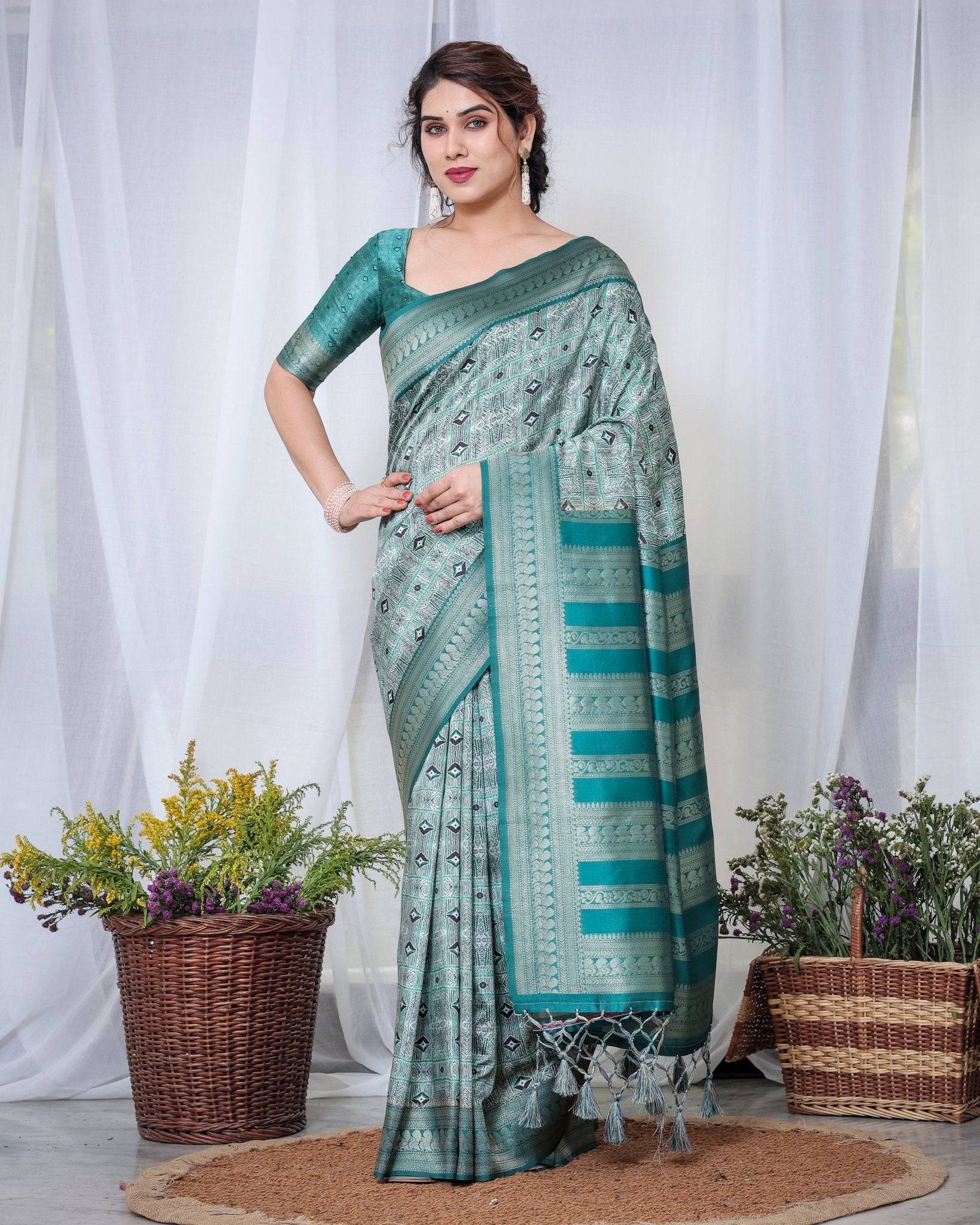 Exude grace and sophistication with this Banarasi digitally printed green silk saree. Adorned with intricate zari weaving, this saree embodies timeless charm and modern elegance. The tassel detail at the pallu edge adds a playful touch, making it perfect for weddings, festivities, or any grand celebration. Paired with a matching blouse, this saree ensures you leave an unforgettable impression wherever you go.
