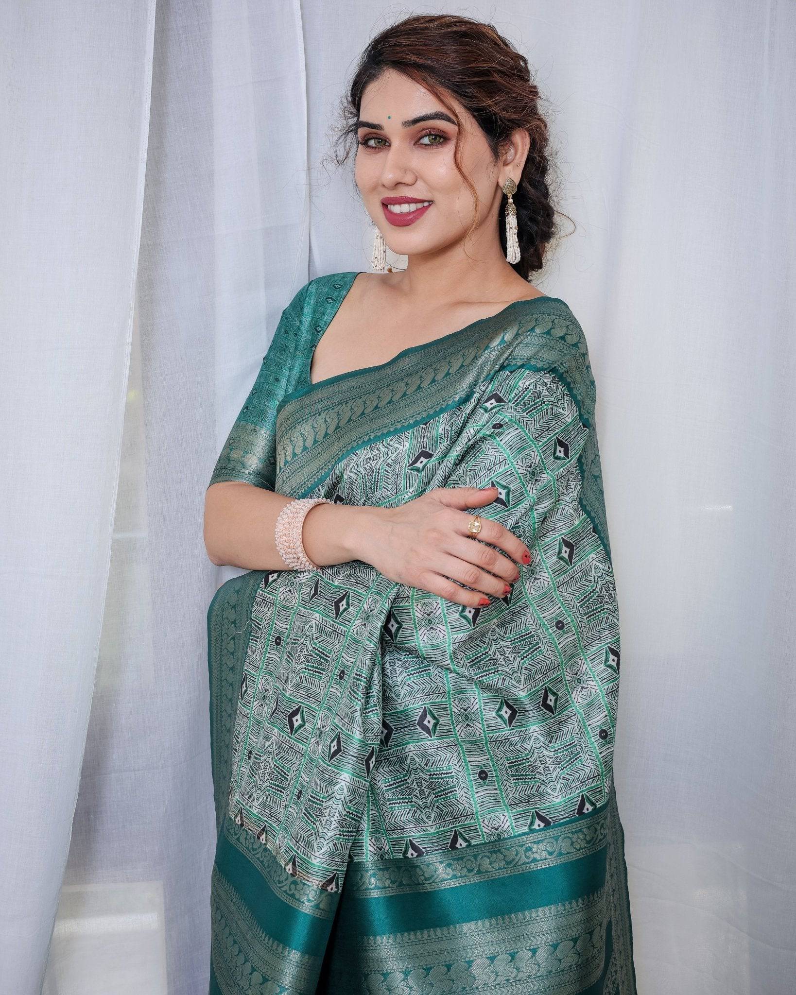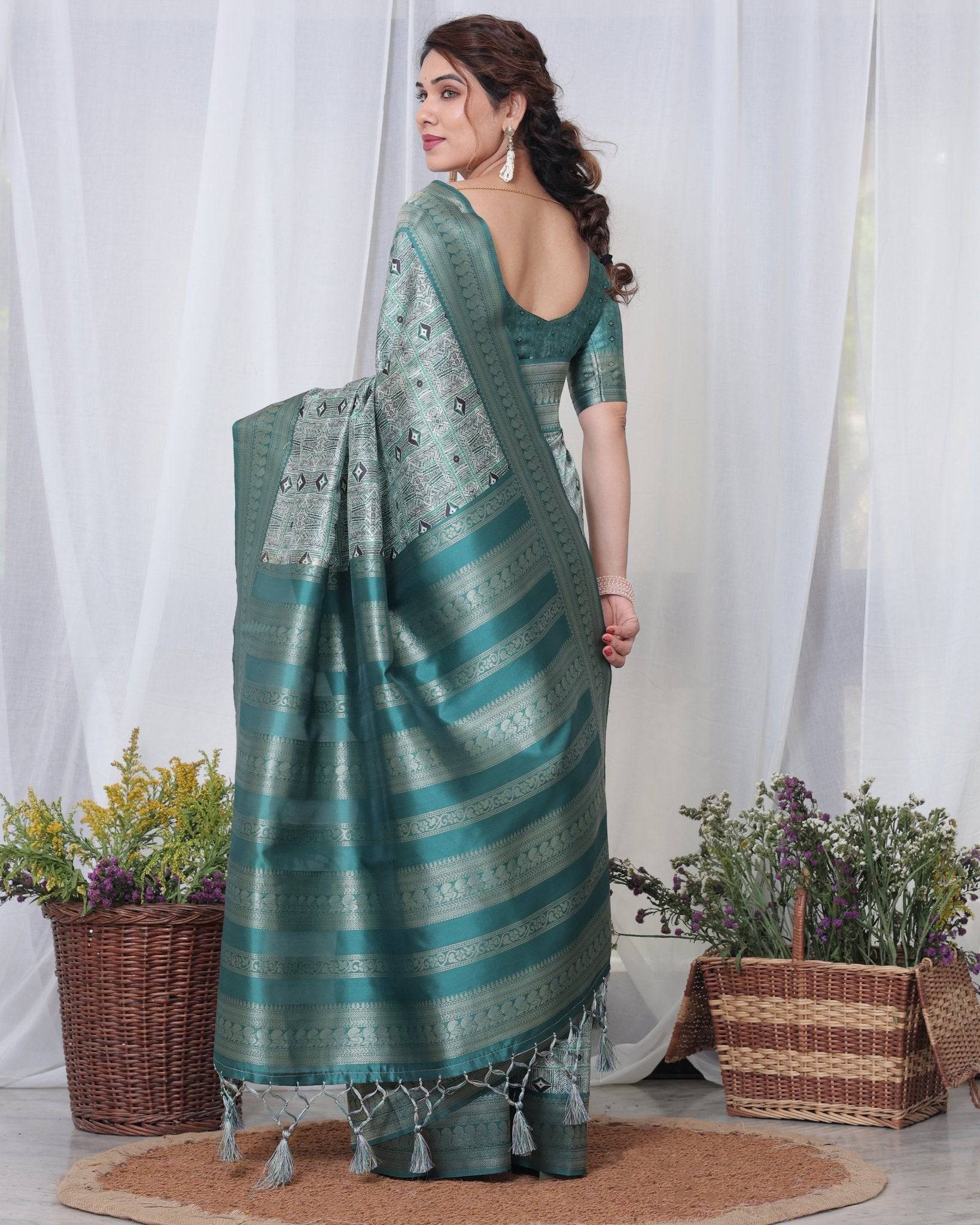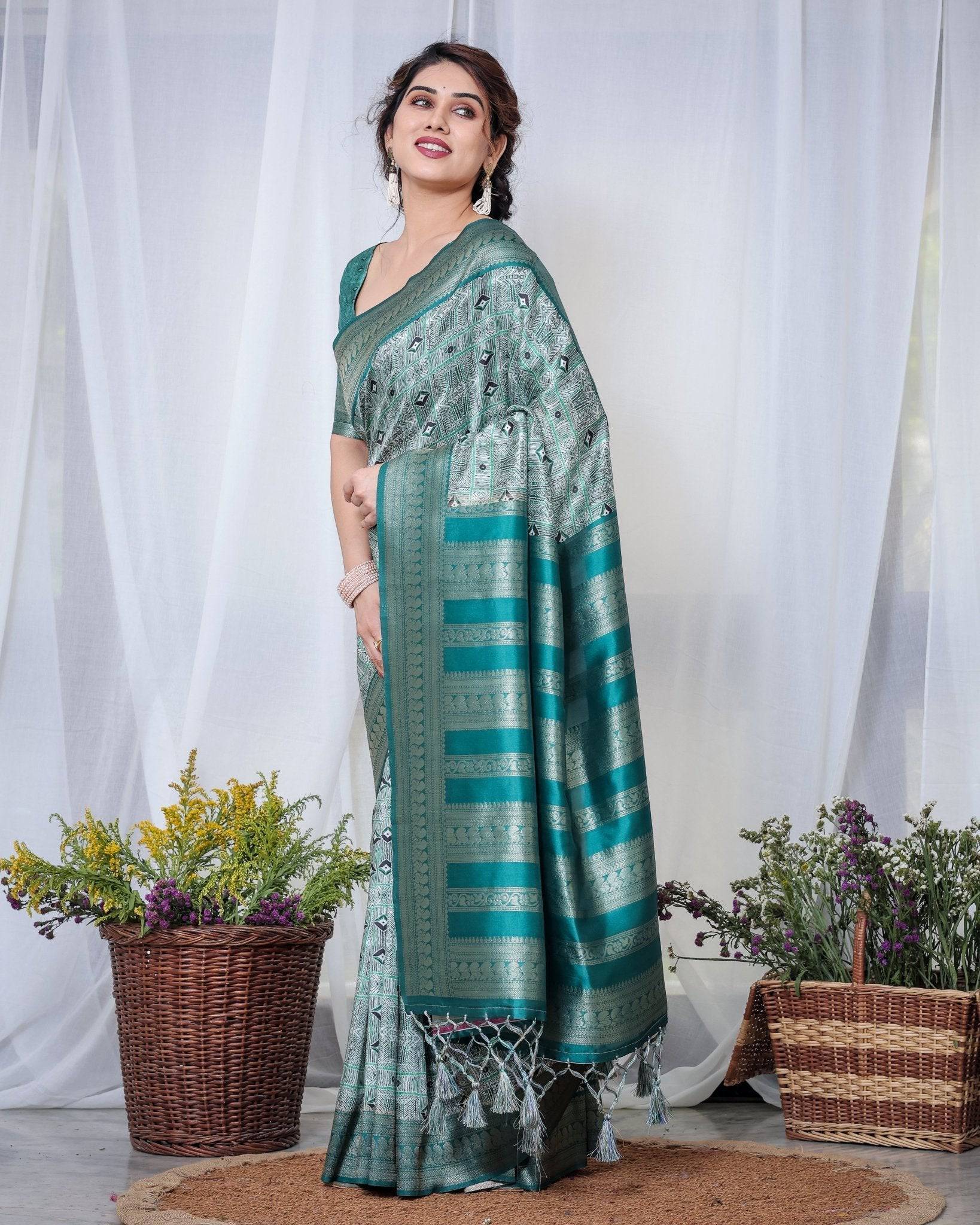 Exude grace and sophistication with this Banarasi digitally printed green silk saree. Adorned with intricate zari weaving, this saree embodies timeless charm and modern elegance. The tassel detail at the pallu edge adds a playful touch, making it perfect for weddings, festivities, or any grand celebration. Paired with a matching blouse, this saree ensures you leave an unforgettable impression wherever you go.