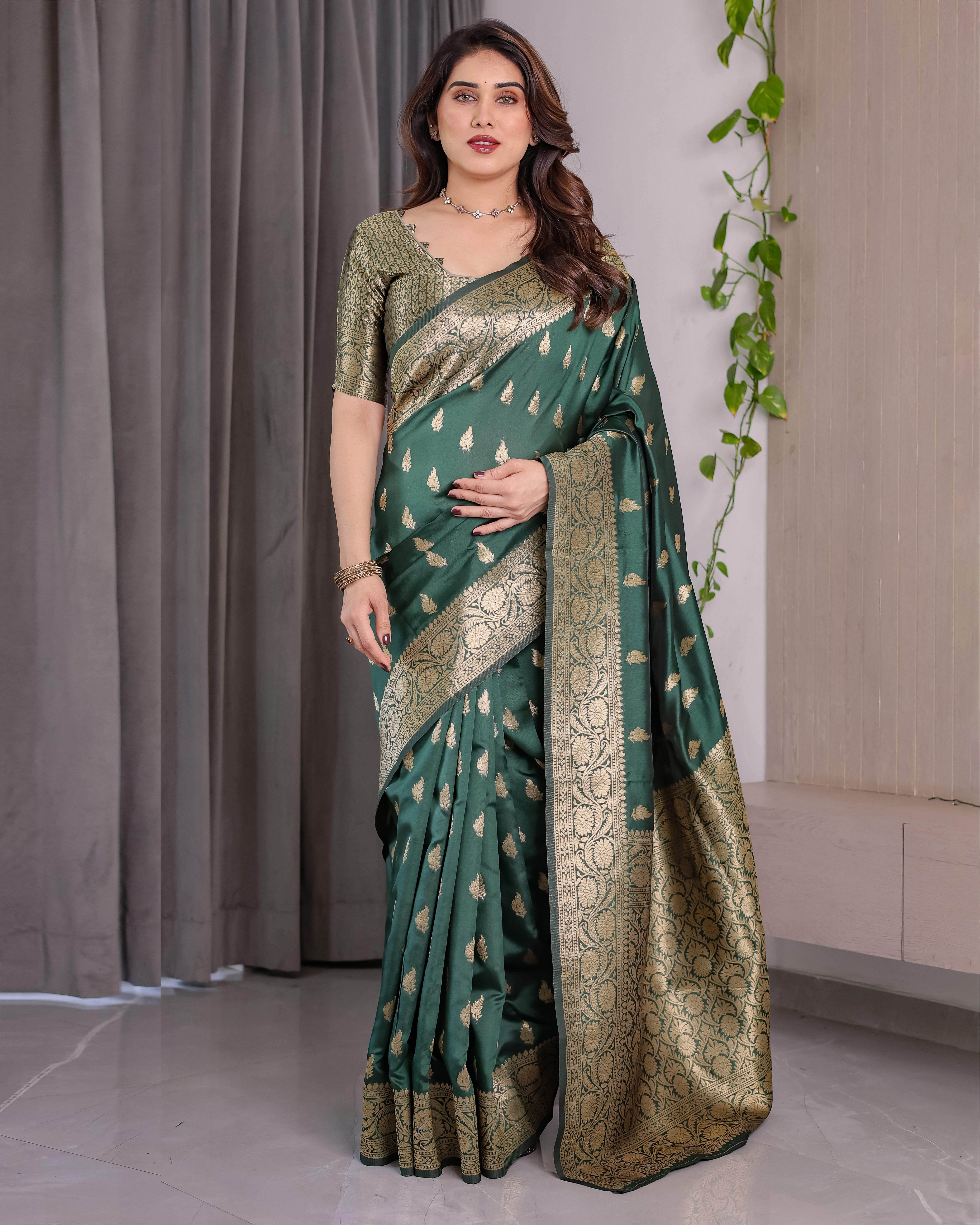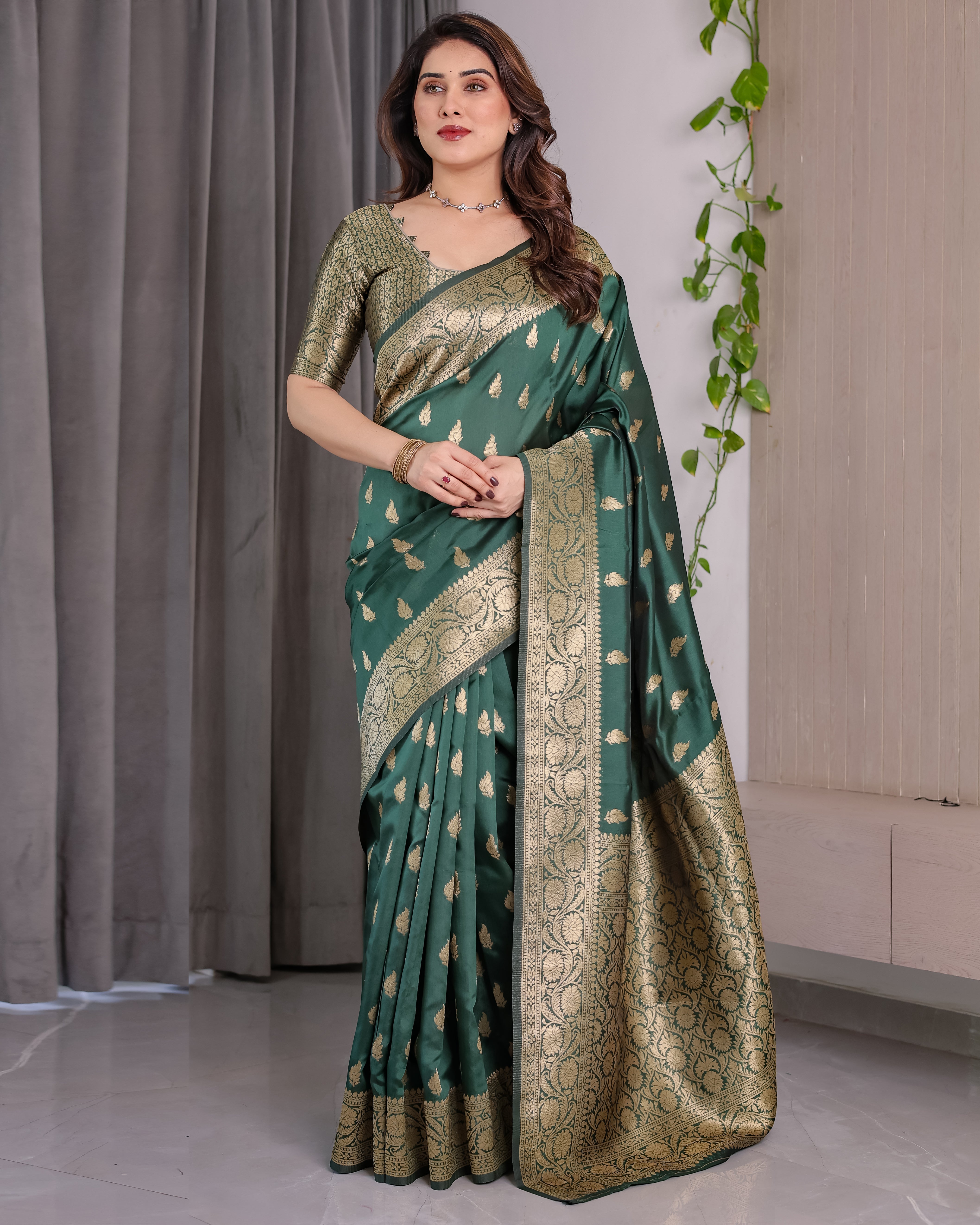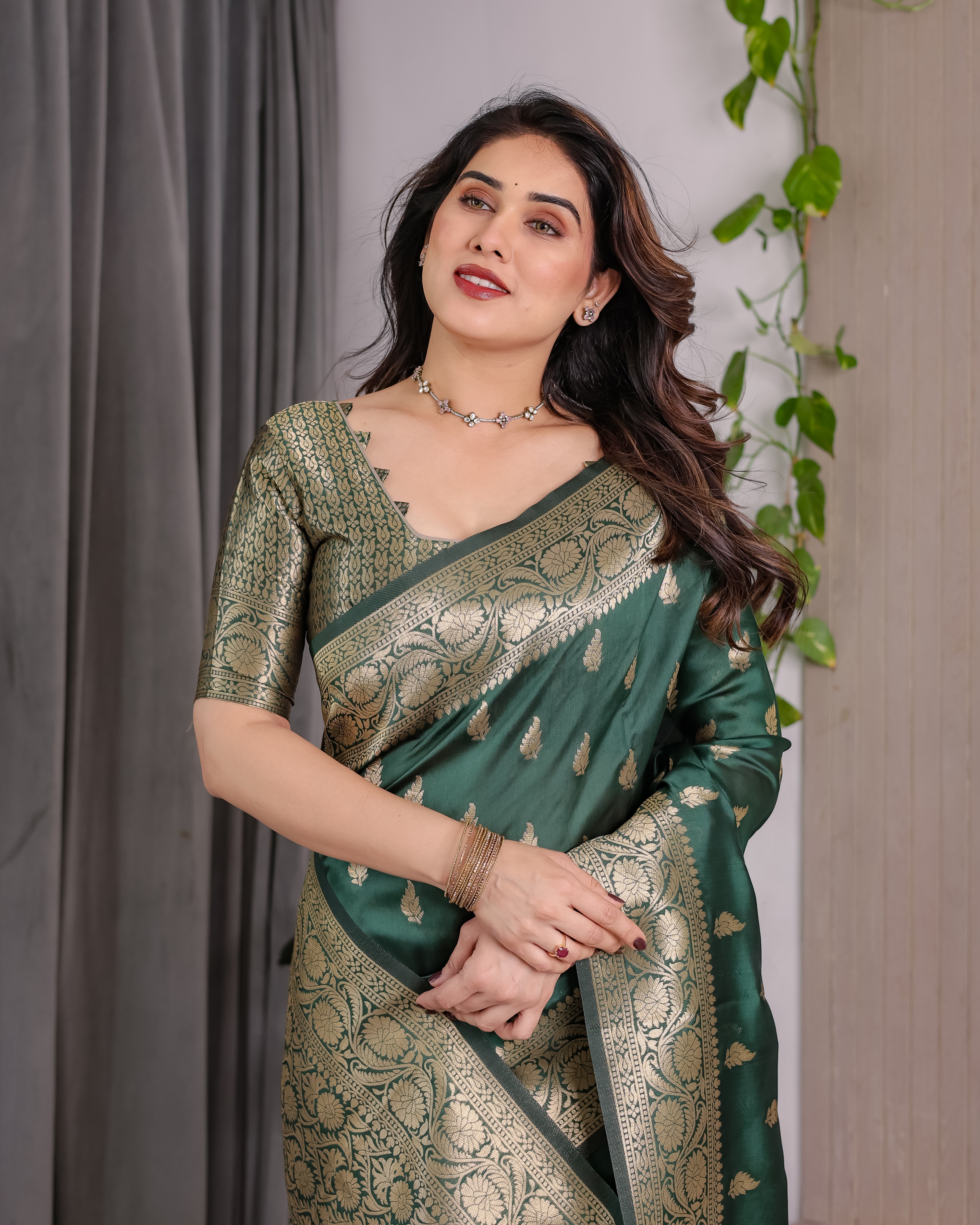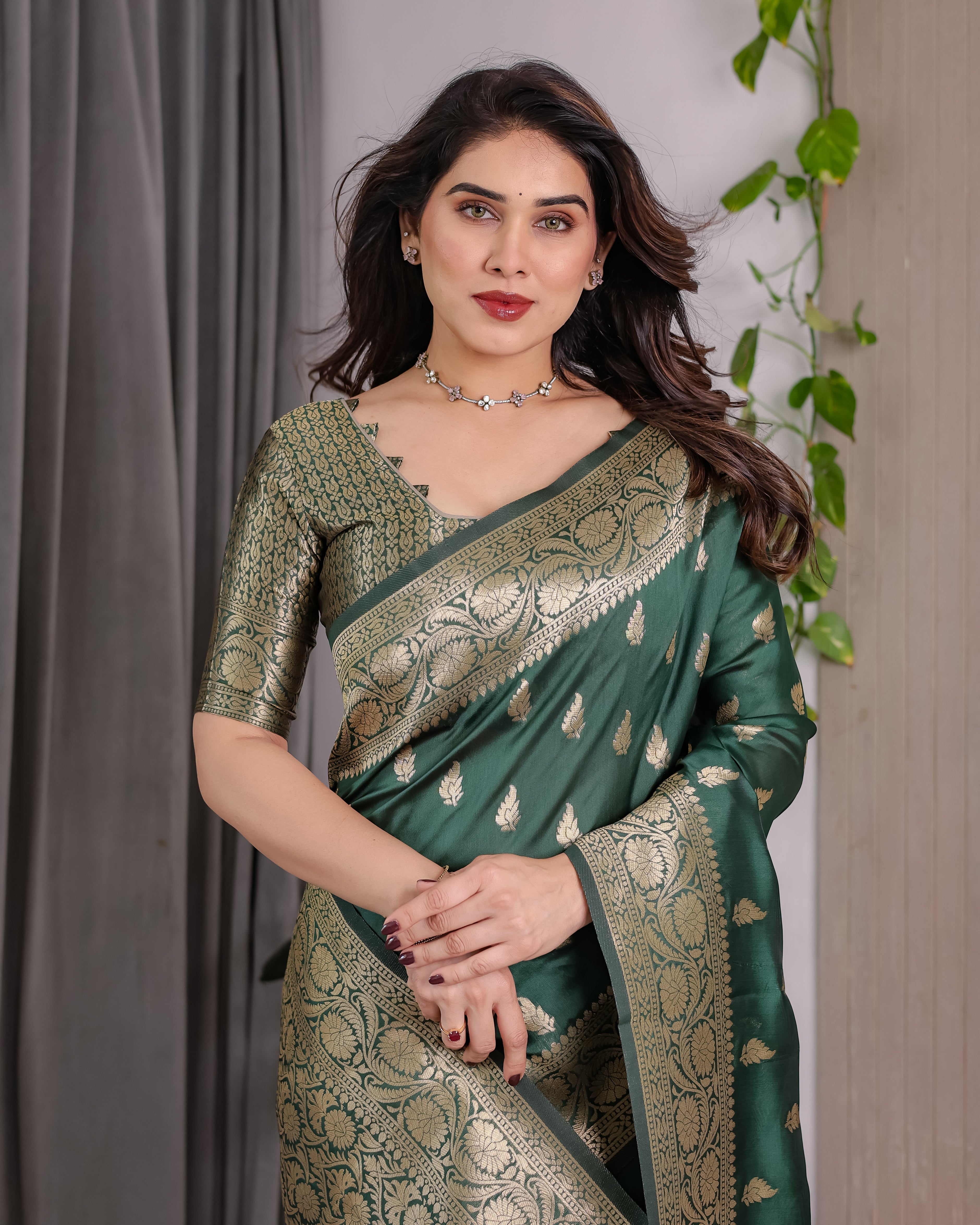 Step into tradition with this breathtaking dark green pure Kanjivaram silk saree, featuring golden woven leaf motifs scattered gracefully across the body. The saree is beautifully complemented by a grand floral golden zari border and richly detailed pallu, celebrating the finesse of South Indian craftsmanship.