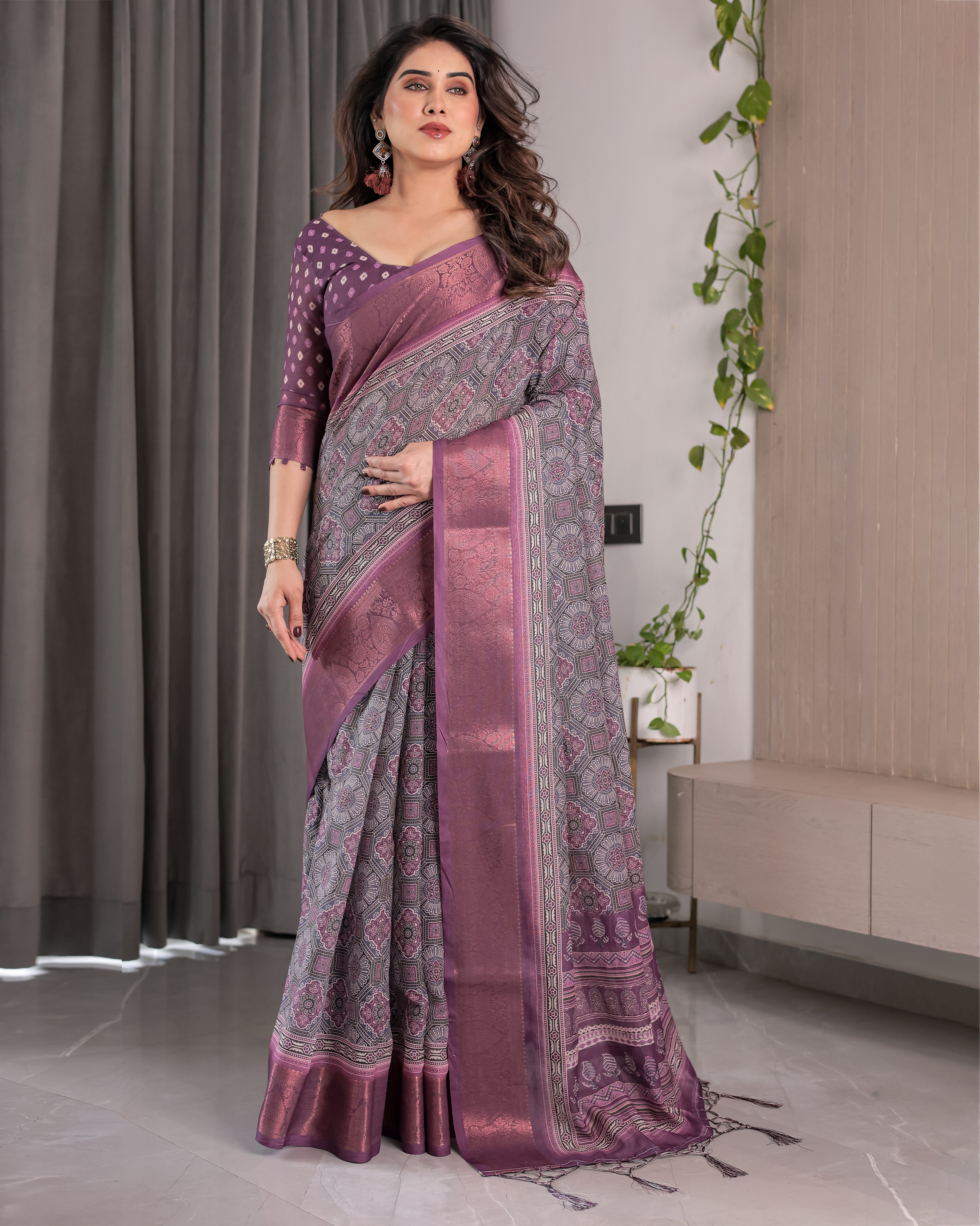 Make a statement in subtle sophistication with this Dusty Purple Handloom Linen Saree, a beautiful amalgamation of traditional craftsmanship and contemporary elegance. The saree features all-over octagonal and floral digital prints in muted tones of lavender, grey, and rosewood, offering a visually rich yet balanced aesthetic.