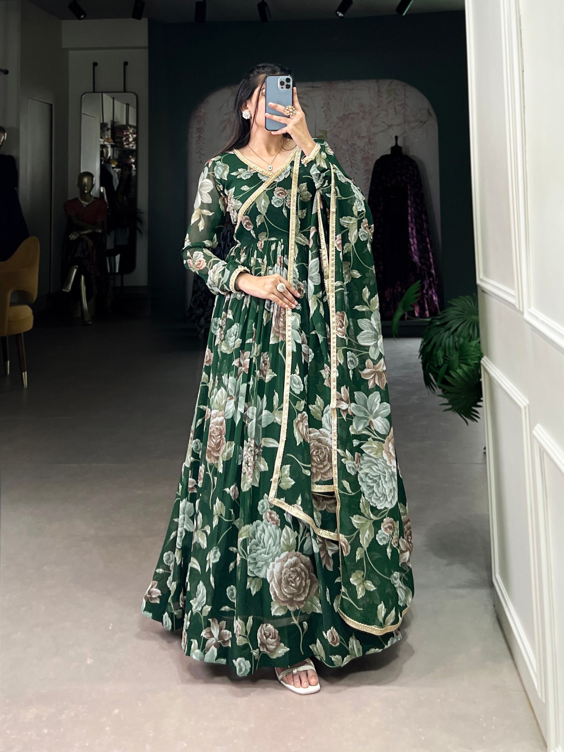 Step into elegance with this Emerald Green Floral Printed Gown Set, an exquisite combination of tradition and modern sophistication. Crafted from premium marble fabric, this ensemble is adorned with delicate floral prints and intricate lace accents, making it perfect for weddings, festive occasions, and special celebrations.