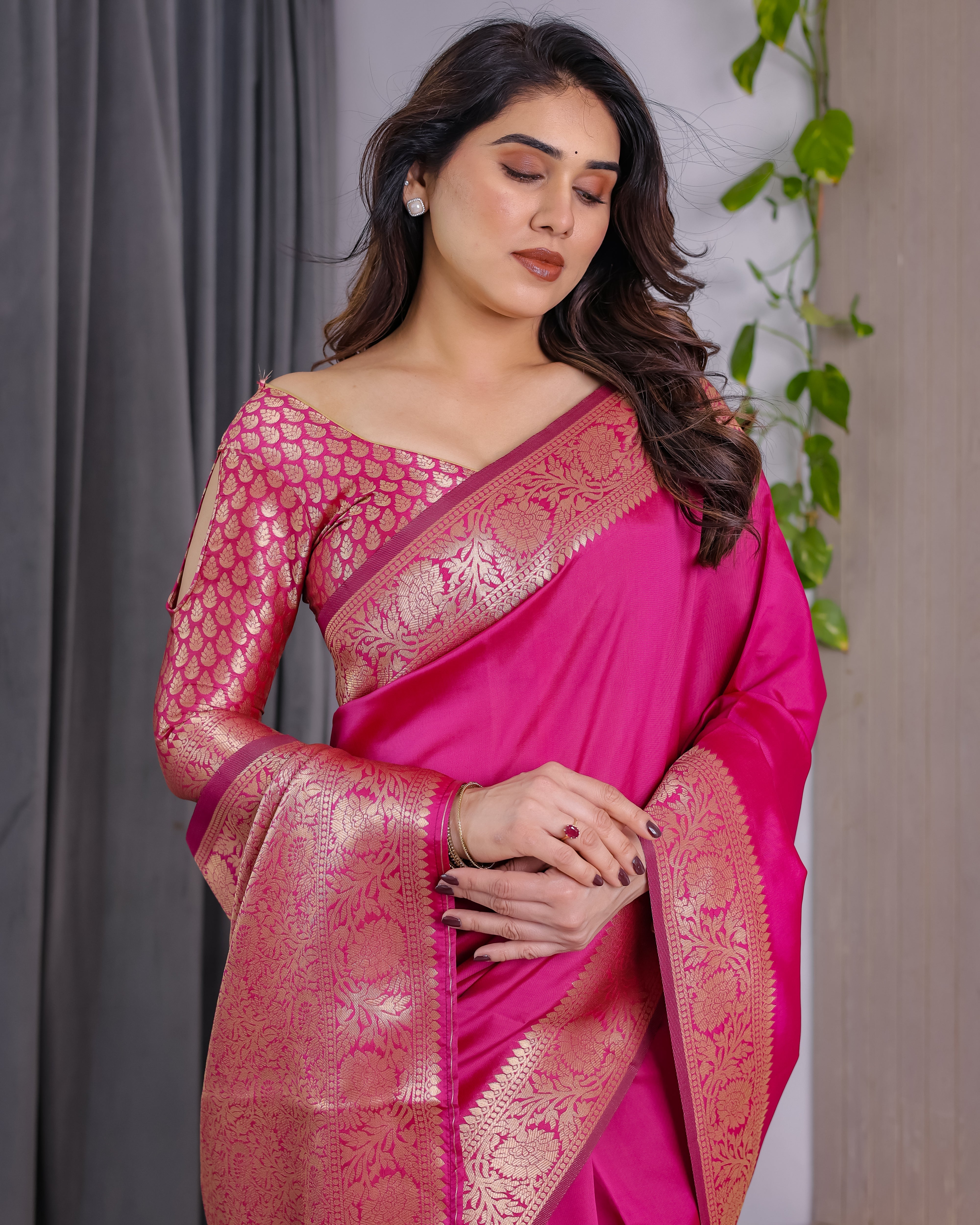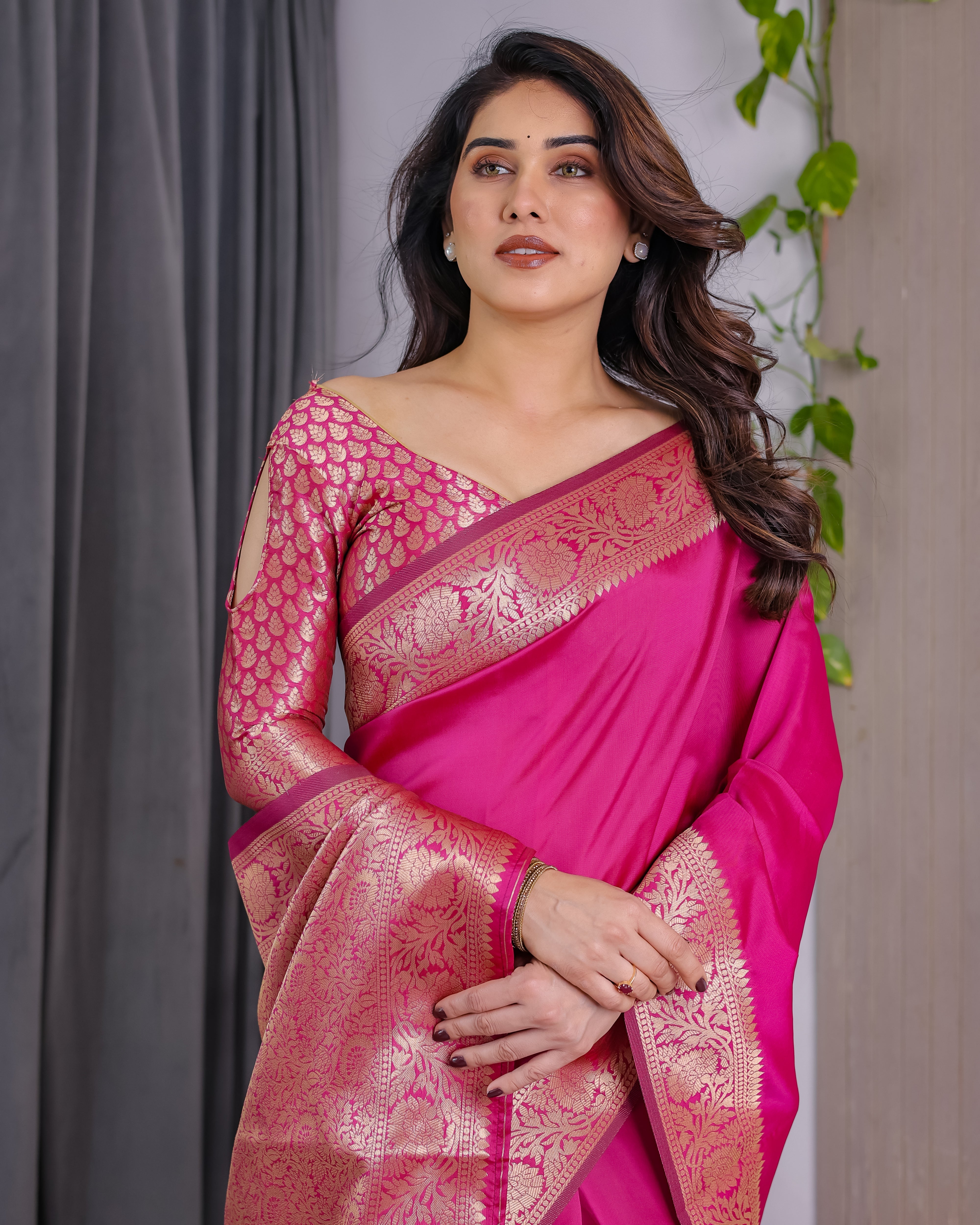 Glow with timeless radiance in this hot pink pure Kanjivaram silk saree, adorned with a finely woven floral zari border and grand golden pallu. The vibrant pink base radiates festive energy, while the ornate zari weaving along the borders brings out traditional richness, making it a must-have for weddings and grand celebrations.