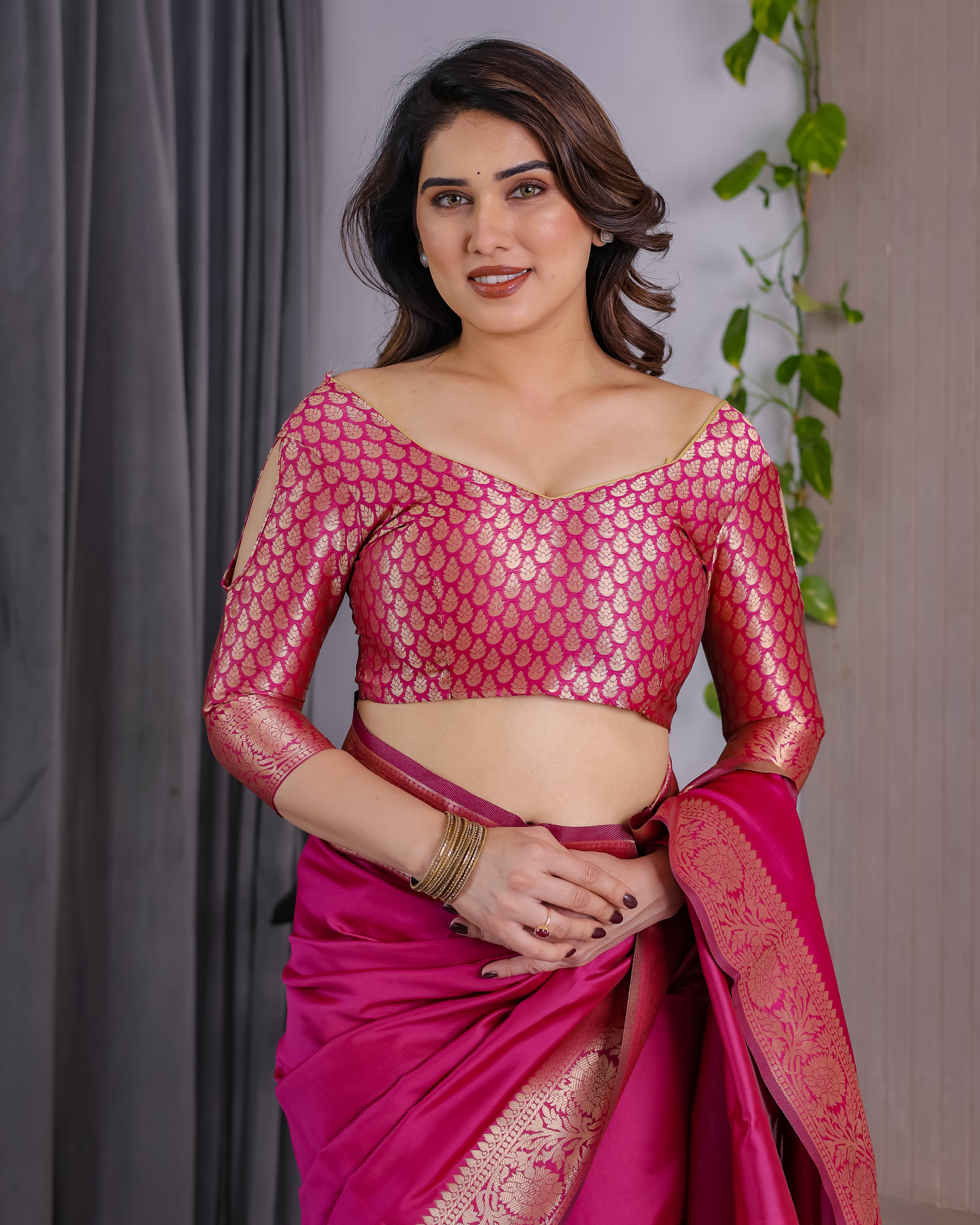 The saree comes with a designer blouse piece (0.8 meters) in coordinated zari-woven fabric featuring intricate mango motifs and a trendy cut-sleeve pattern, offering a perfect blend of tradition and style.