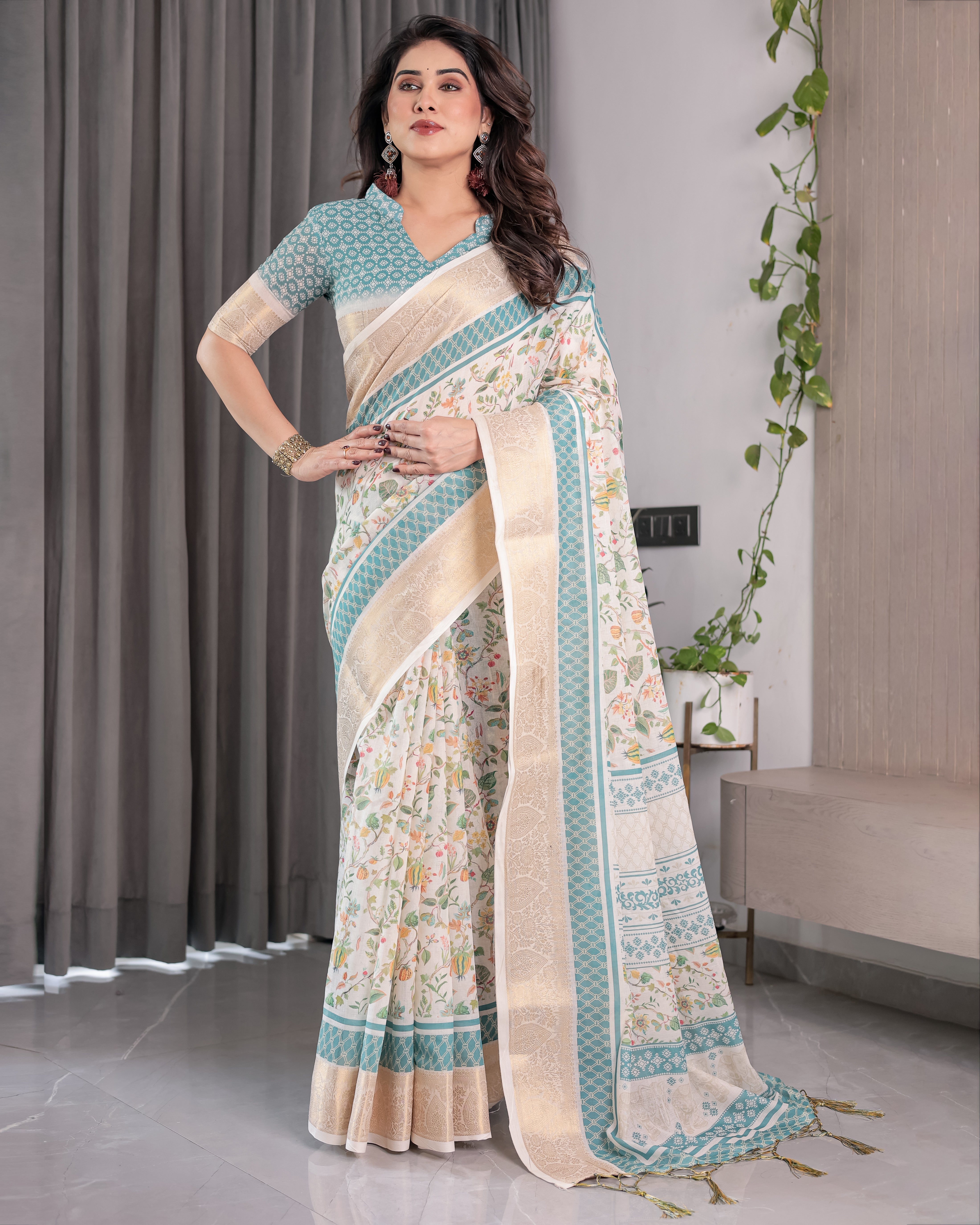 Step into timeless elegance with our Ivory White Handloom Linen Saree, exquisitely adorned with an aqua blue floral digital print and detailed zari weaving. This saree effortlessly merges soft pastel charm with regal craftsmanship, making it a luxurious yet breathable option for everyday and special occasions.