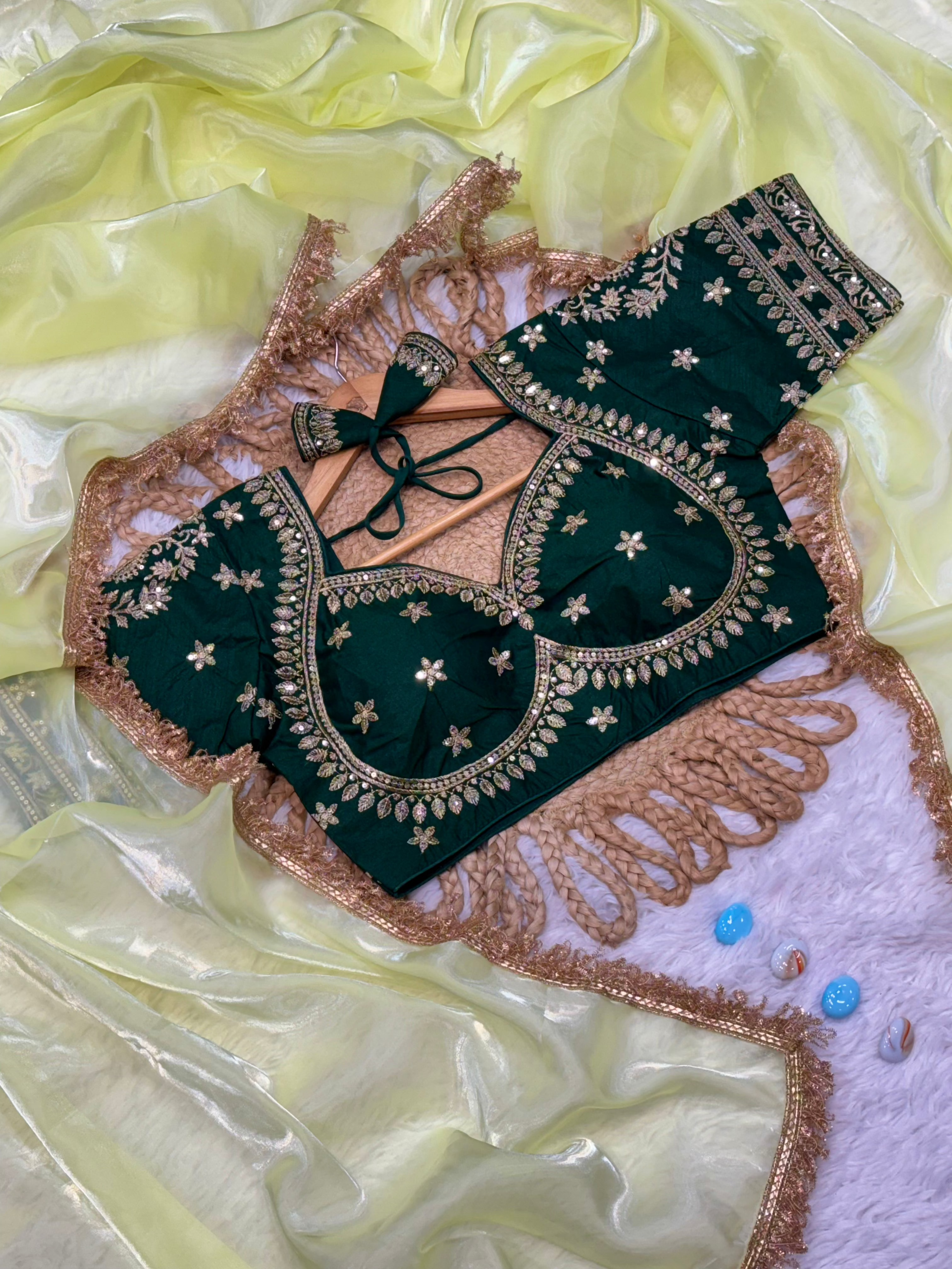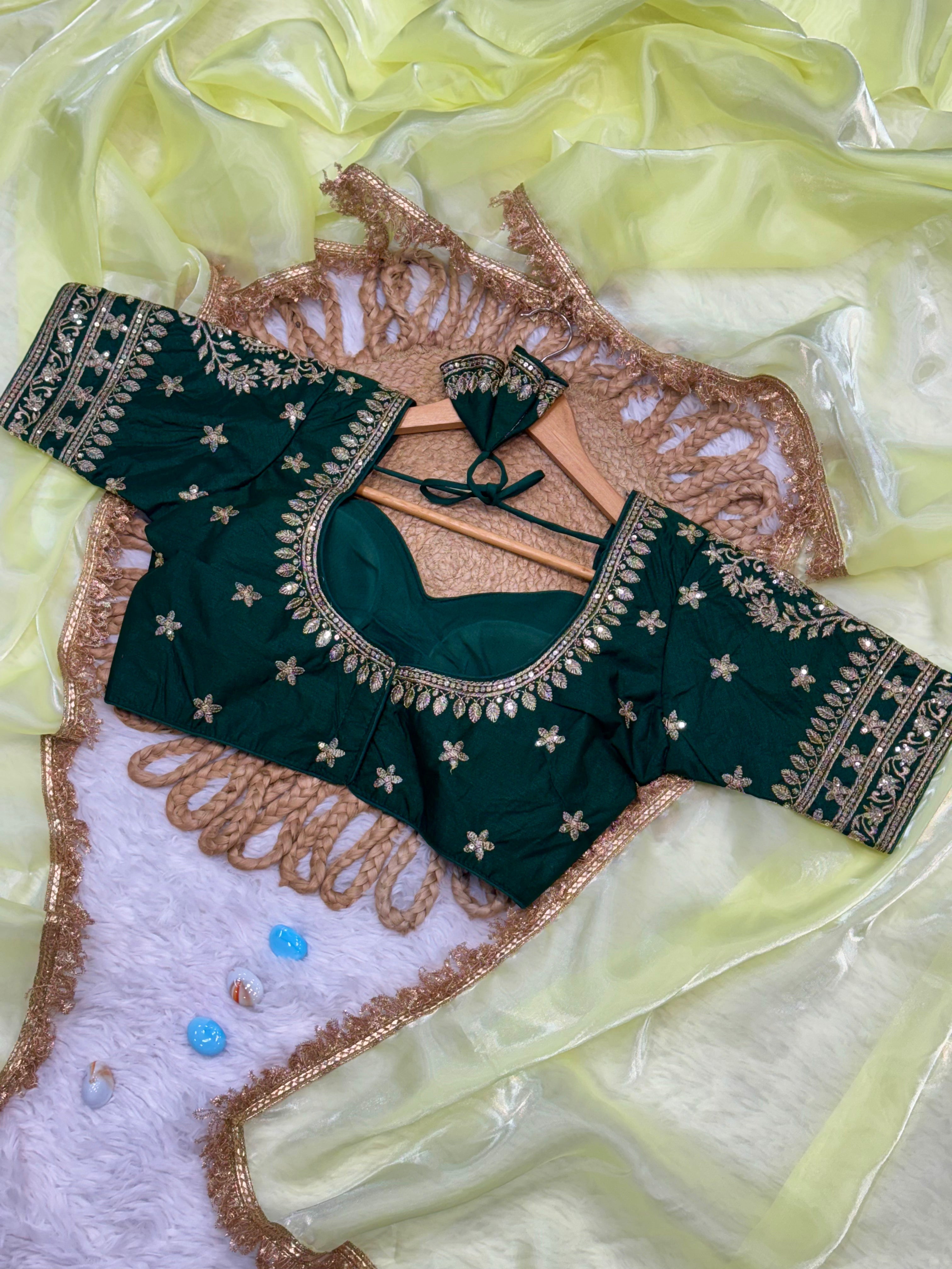 Paired with a striking Forest Green Ready-Made Blouse, crafted from premium Vichitra fabric and intricately embroidered with golden floral patterns, this set is a showstopper. Designed to fit sizes 38 to 42, the blouse offers both comfort and a flattering fit.