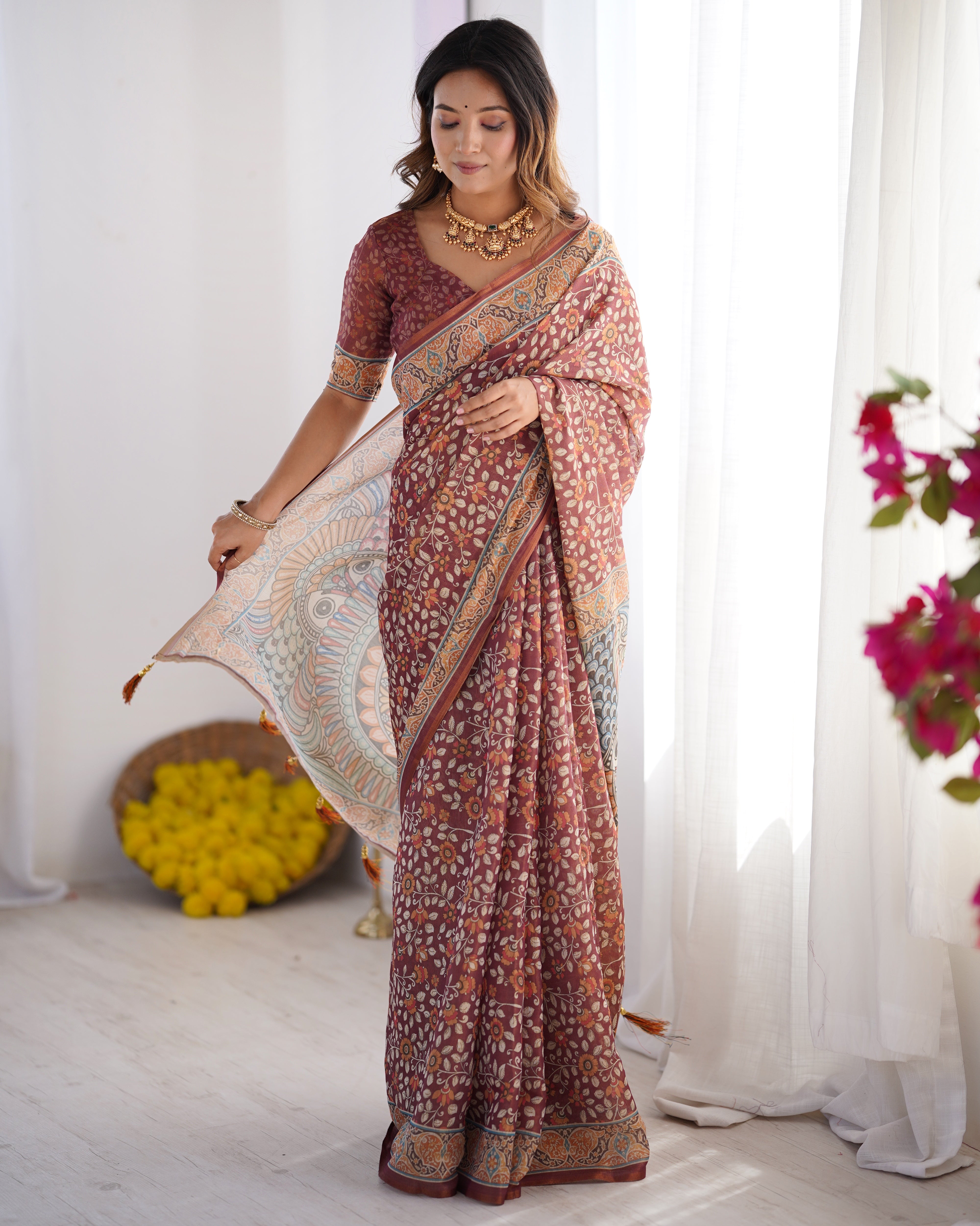 Paired with a coordinated maroon blouse featuring minimal floral print, this saree brings cultural storytelling to life in a subtle yet powerful way.