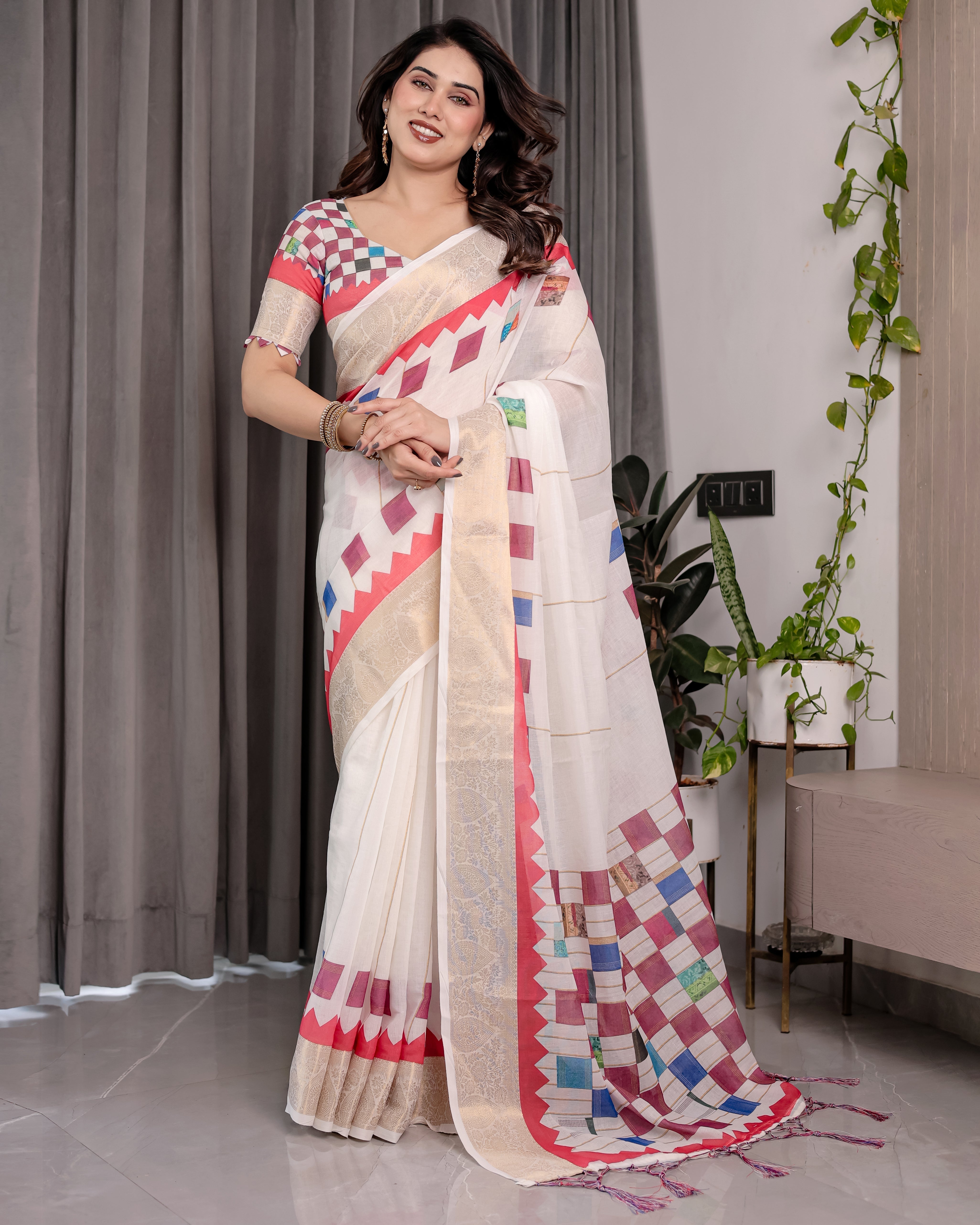 Add a contemporary twist to your ethnic wardrobe with this graceful off-white handloom linen saree, highlighted by a striking multicolor checkered pallu and a beautifully detailed red and golden zari-woven border. The minimal base tone is elevated with geometric color play, offering a unique blend of heritage and modern design.