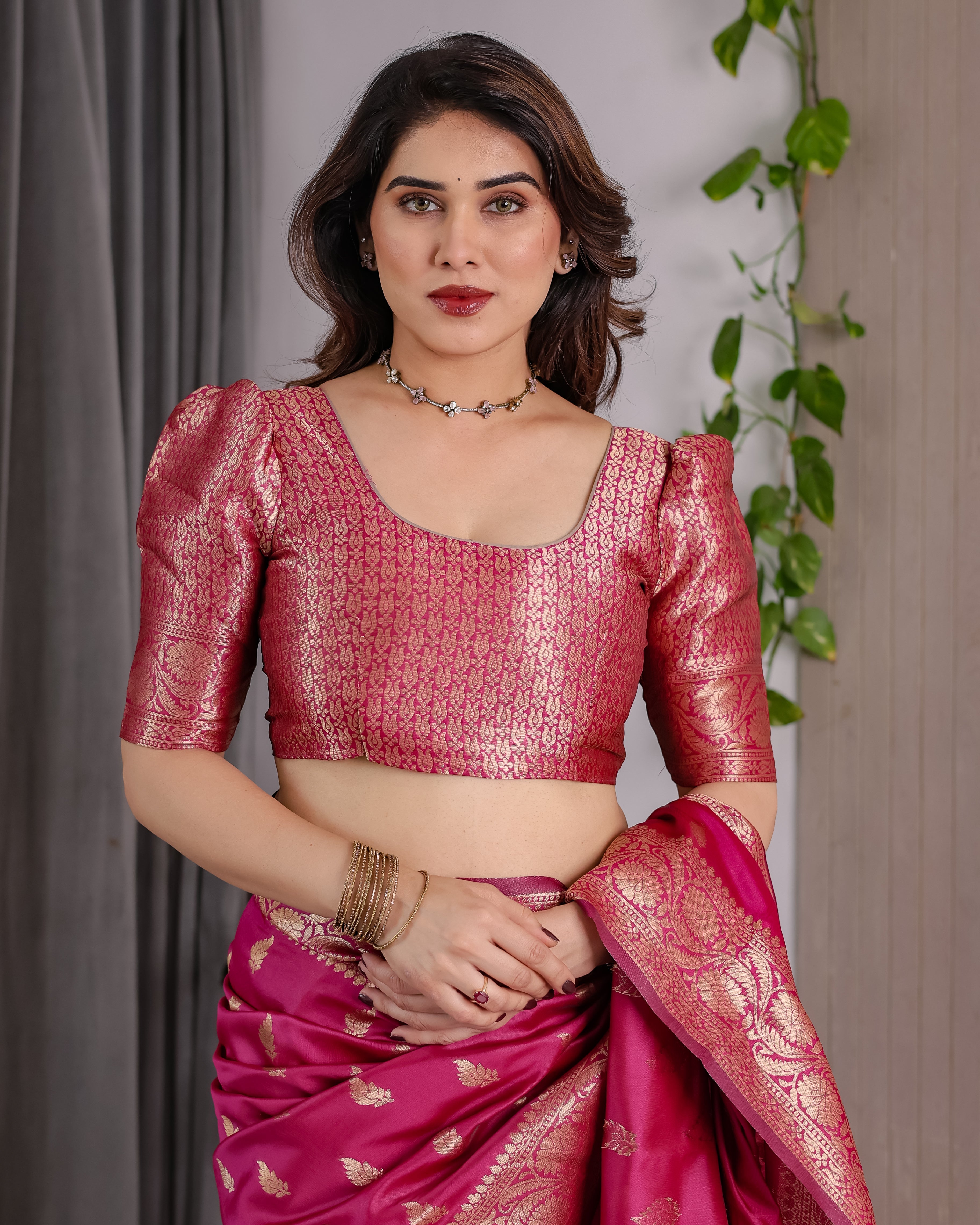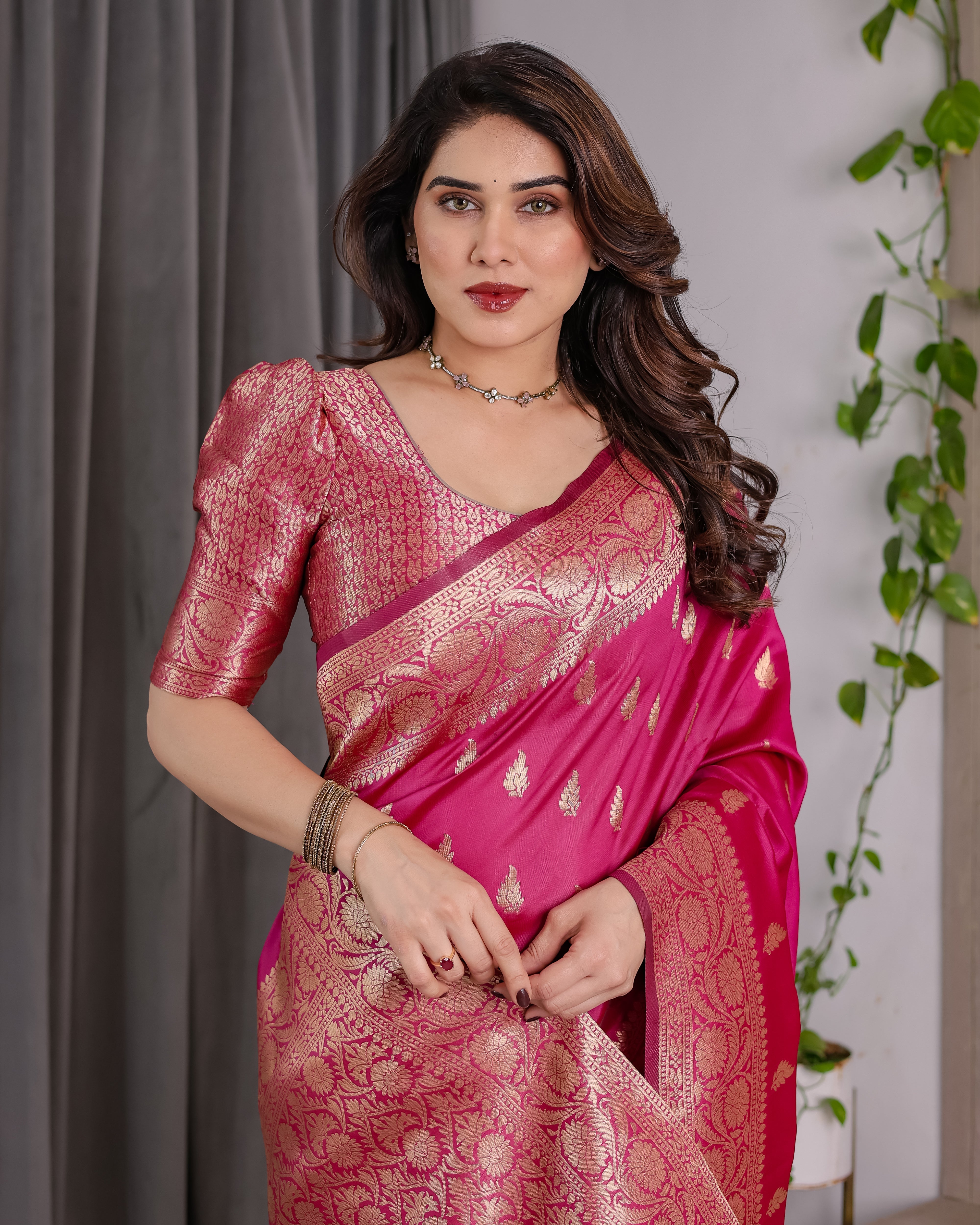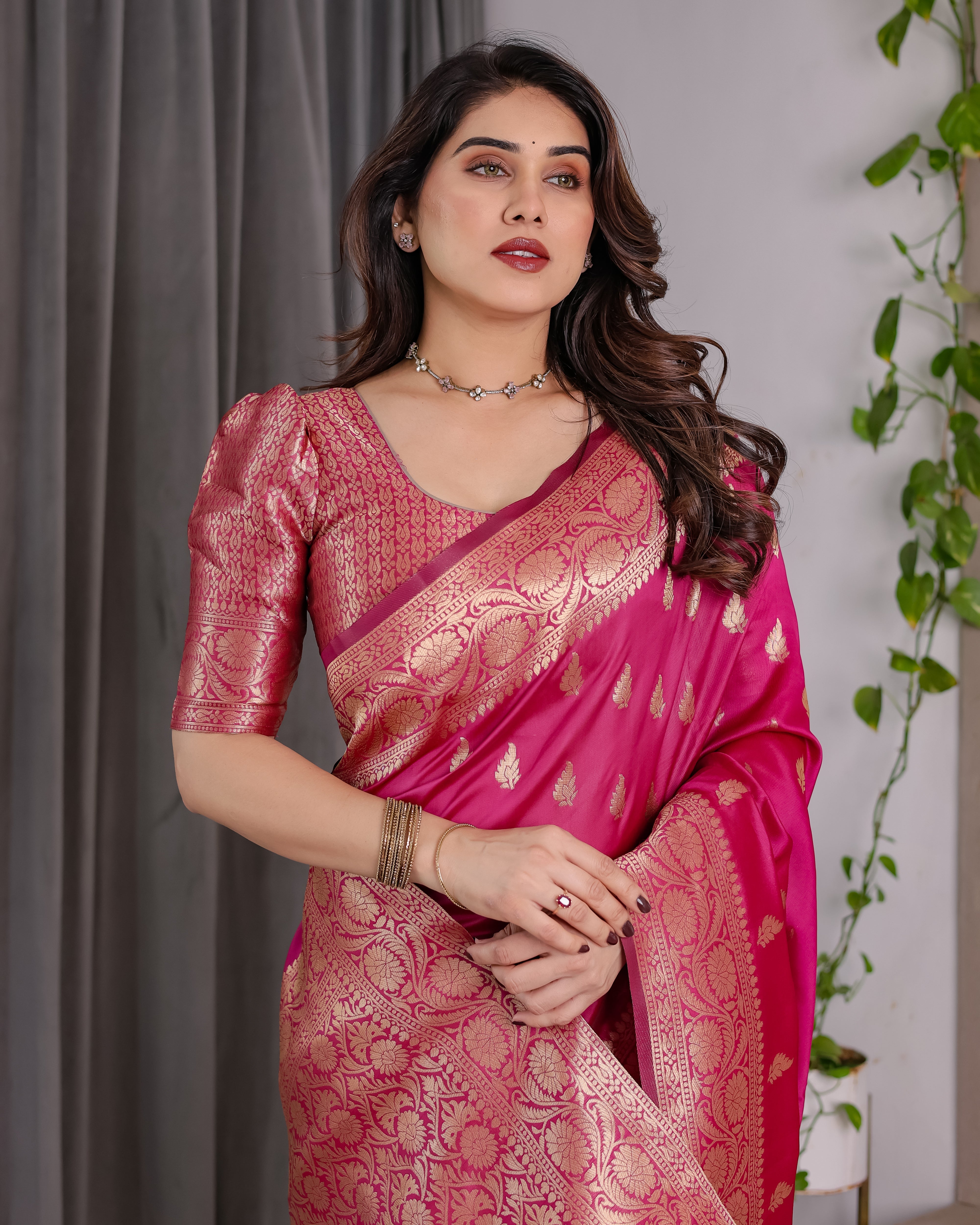 Gracefully bold and eternally festive, this rani pink pure Kanjivaram silk saree is adorned with classic golden leaf motifs and a grand floral zari pallu and border that exudes traditional richness. The striking pink base enhances the sheen of gold zari, offering a vibrant yet regal look ideal for weddings, festive gatherings, or bridal trousseau.