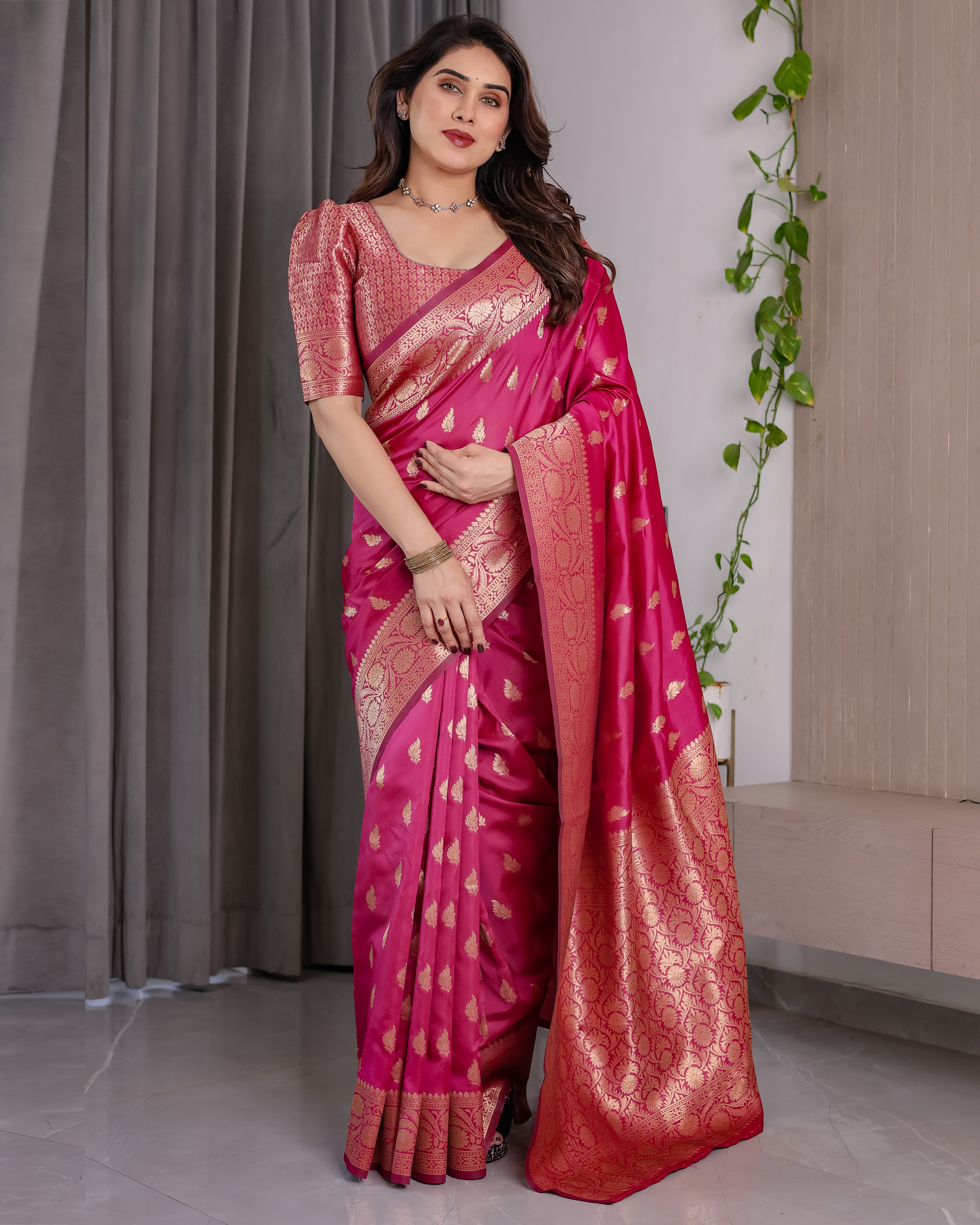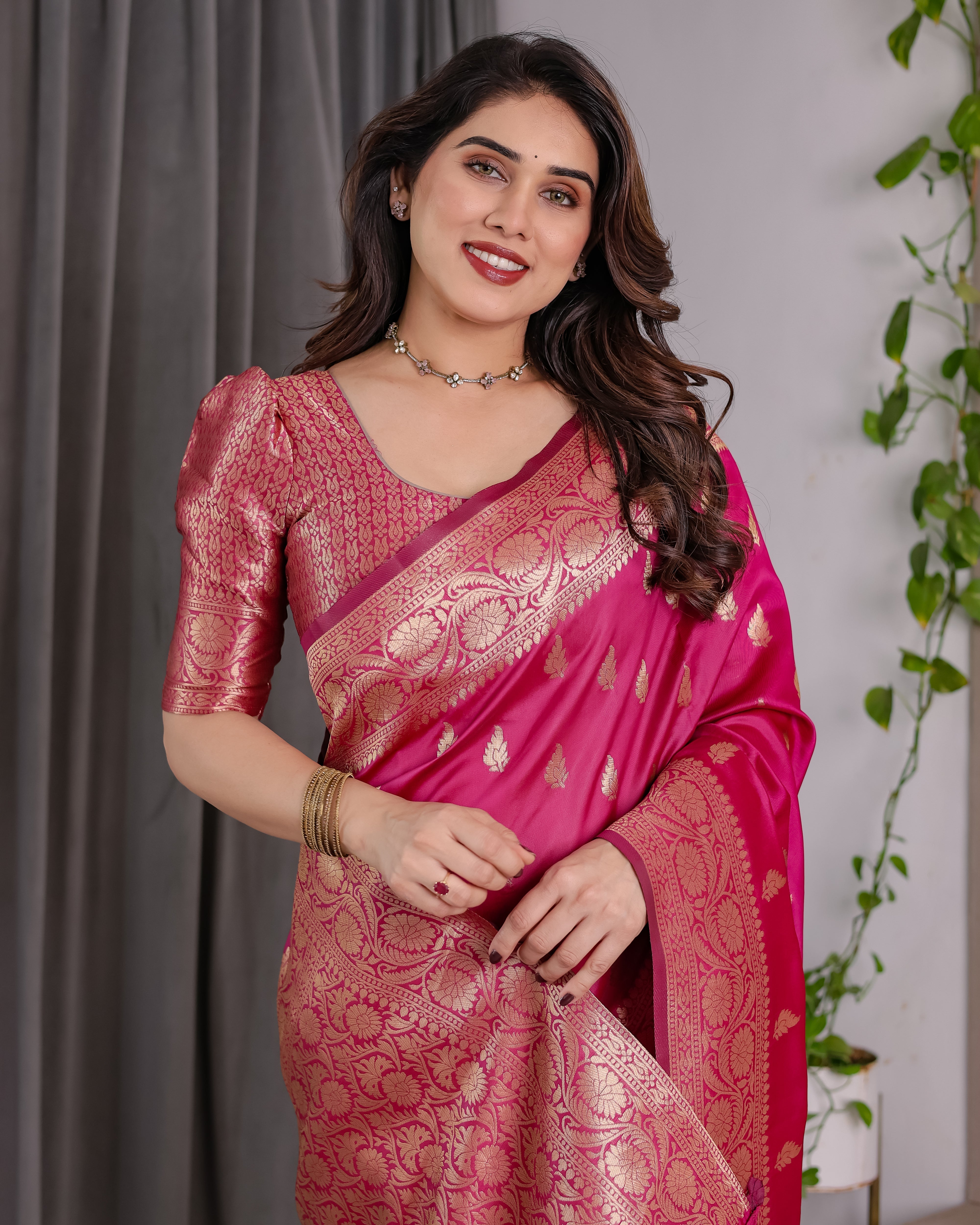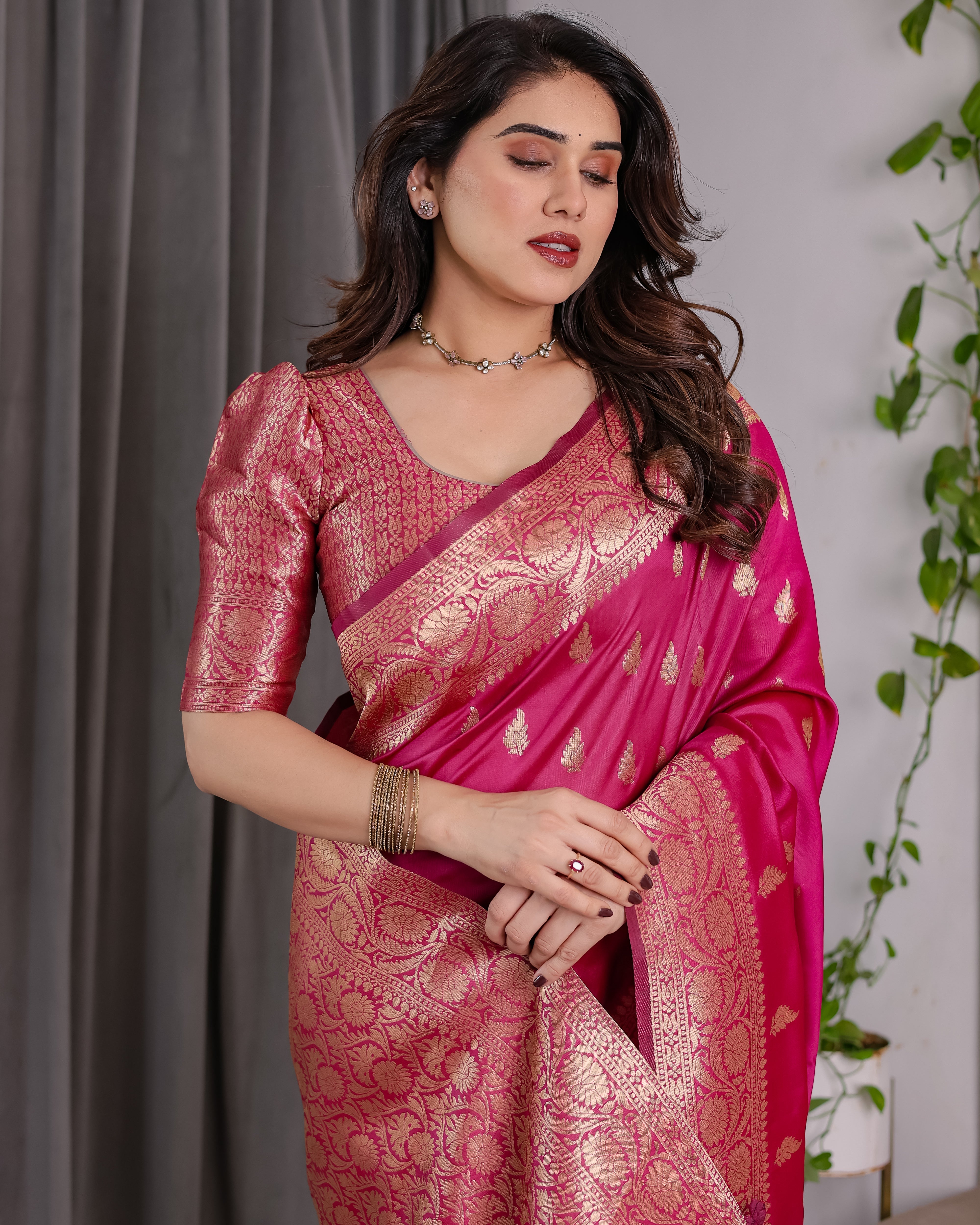 Gracefully bold and eternally festive, this rani pink pure Kanjivaram silk saree is adorned with classic golden leaf motifs and a grand floral zari pallu and border that exudes traditional richness. The striking pink base enhances the sheen of gold zari, offering a vibrant yet regal look ideal for weddings, festive gatherings, or bridal trousseau.