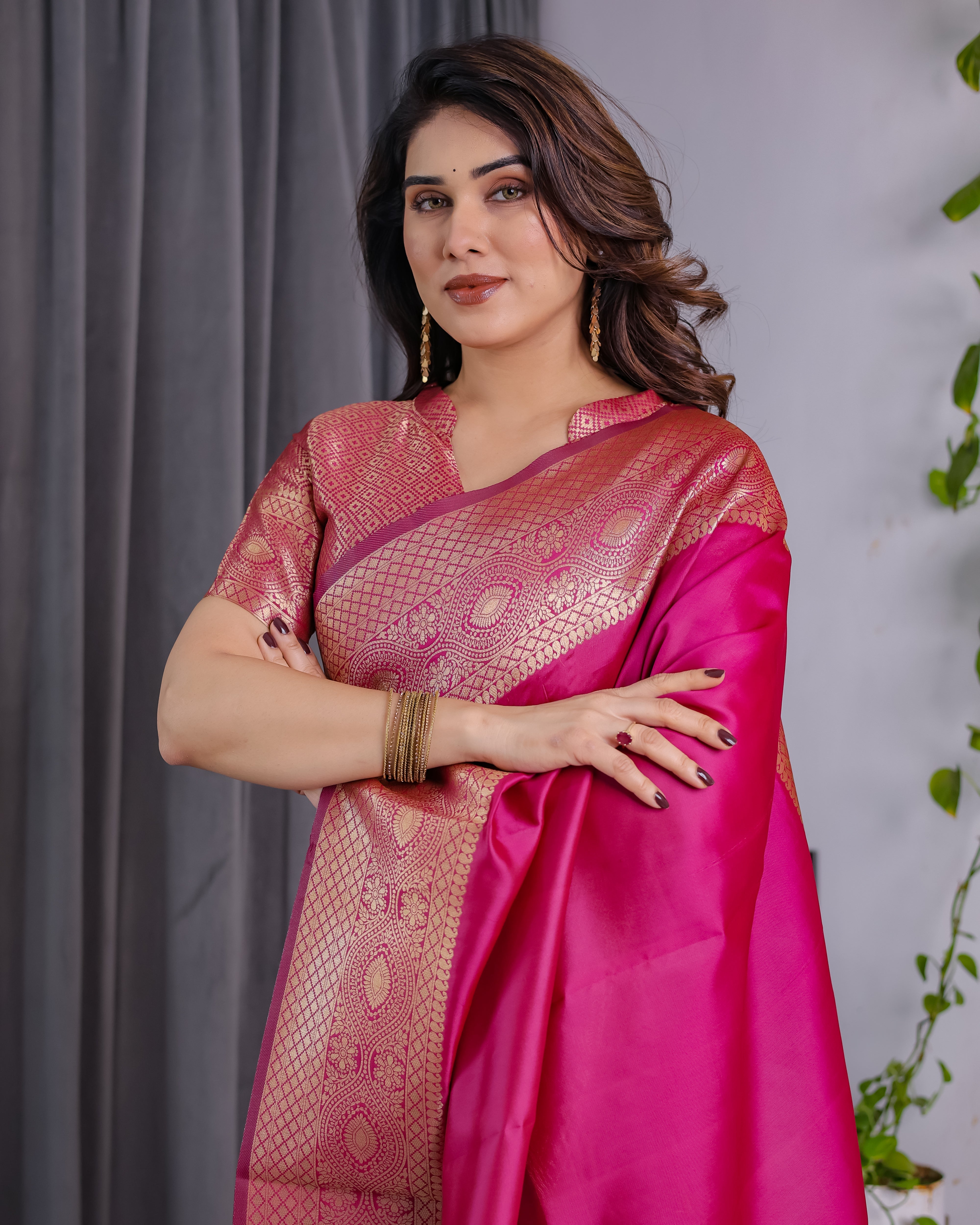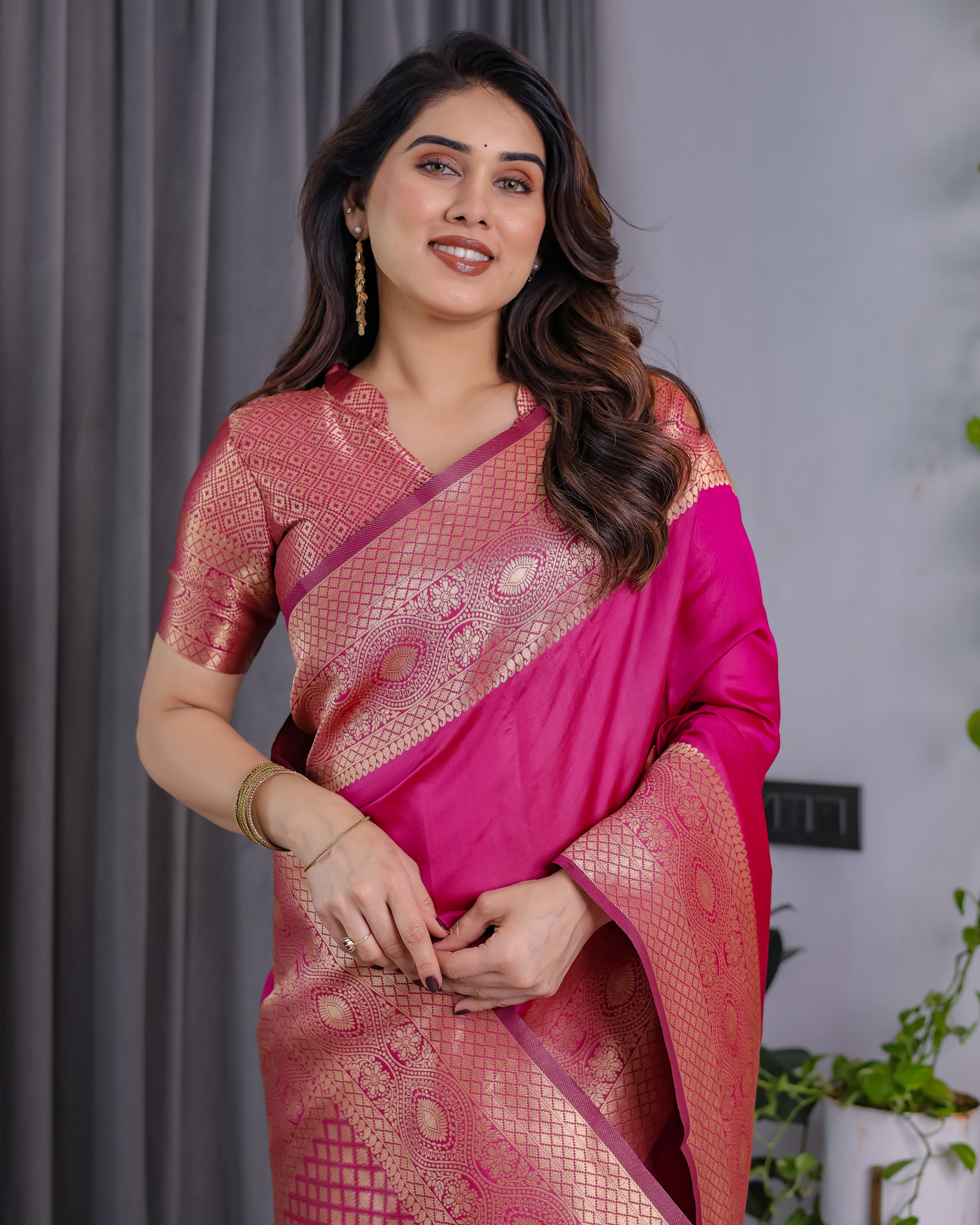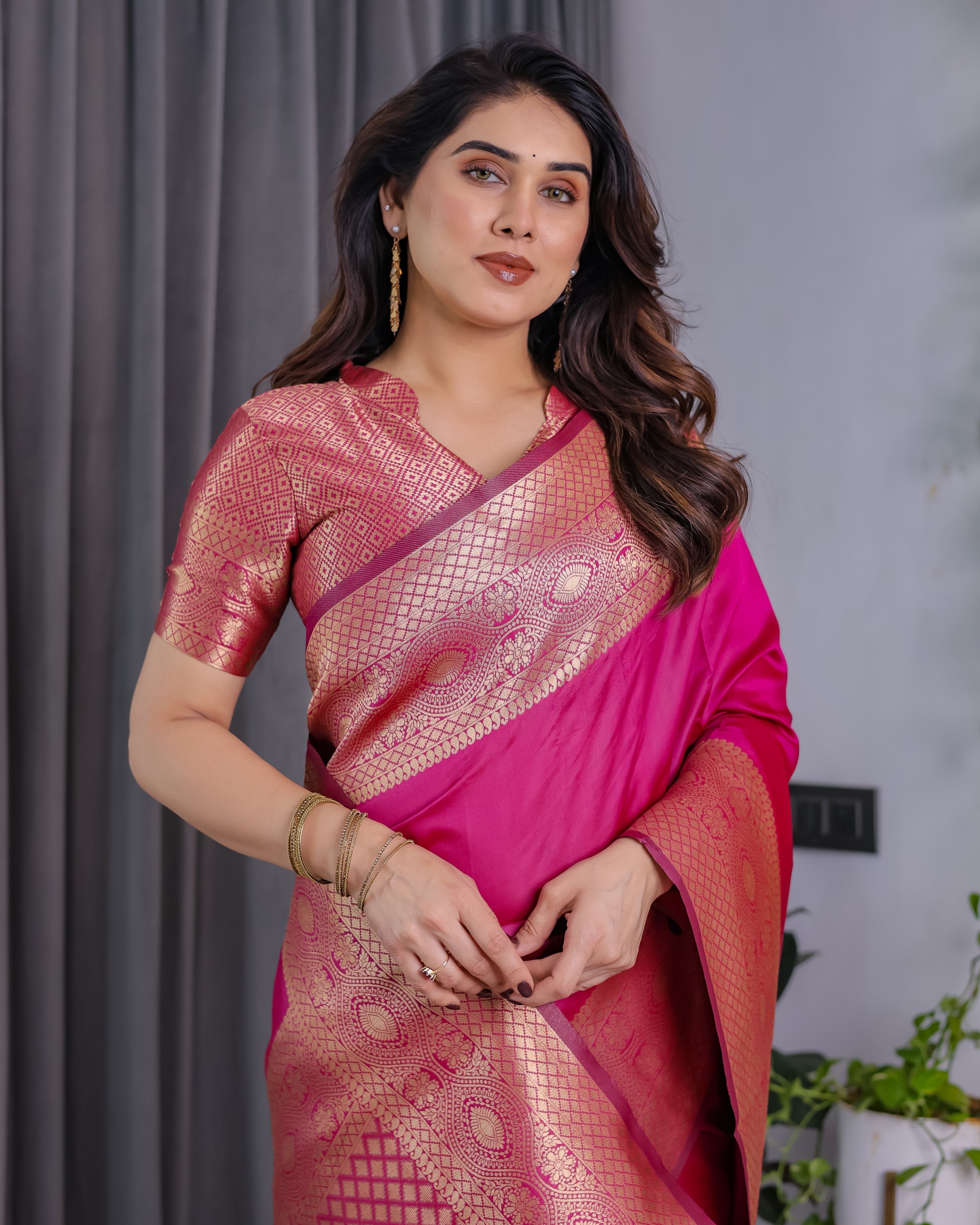 Make a striking statement in this radiant rani pink pure Kanjivaram silk saree, meticulously woven with rich golden zari work. The saree exudes regal charm with its grand border and pallu featuring intricate paisley and floral motifs, finished with a classic cross-weave pattern for added richness.