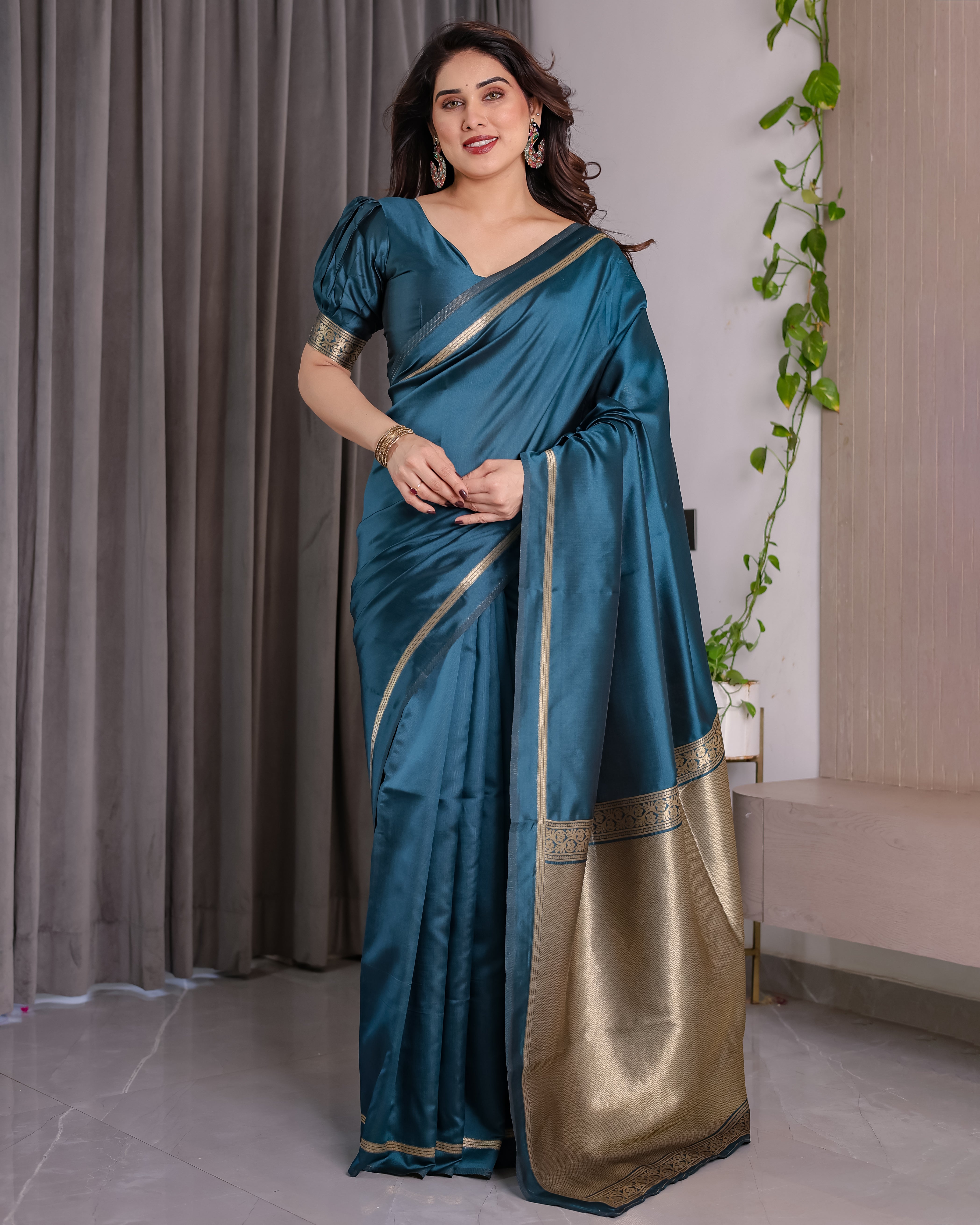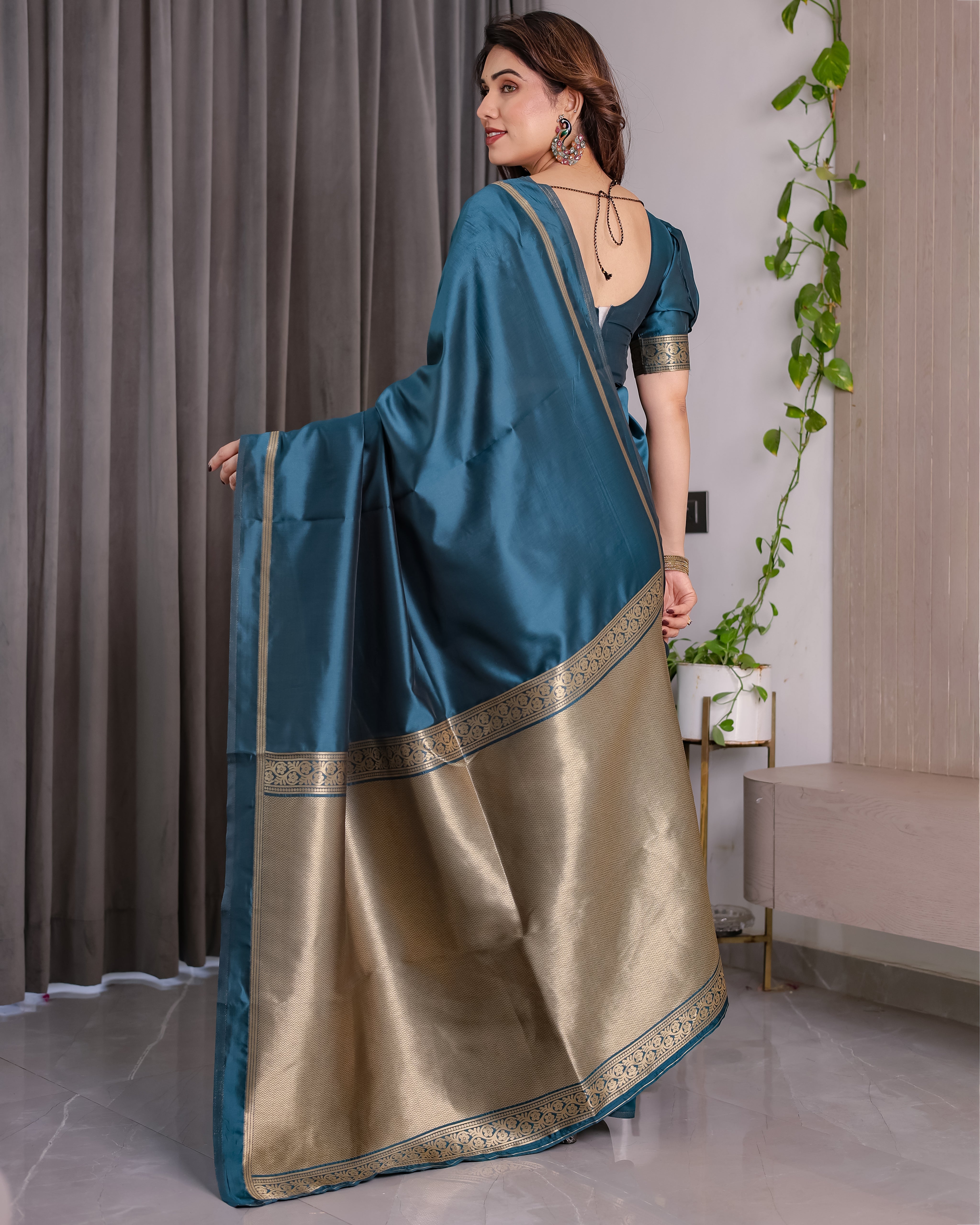 Color: Teal Blue with golden zari border & pallu