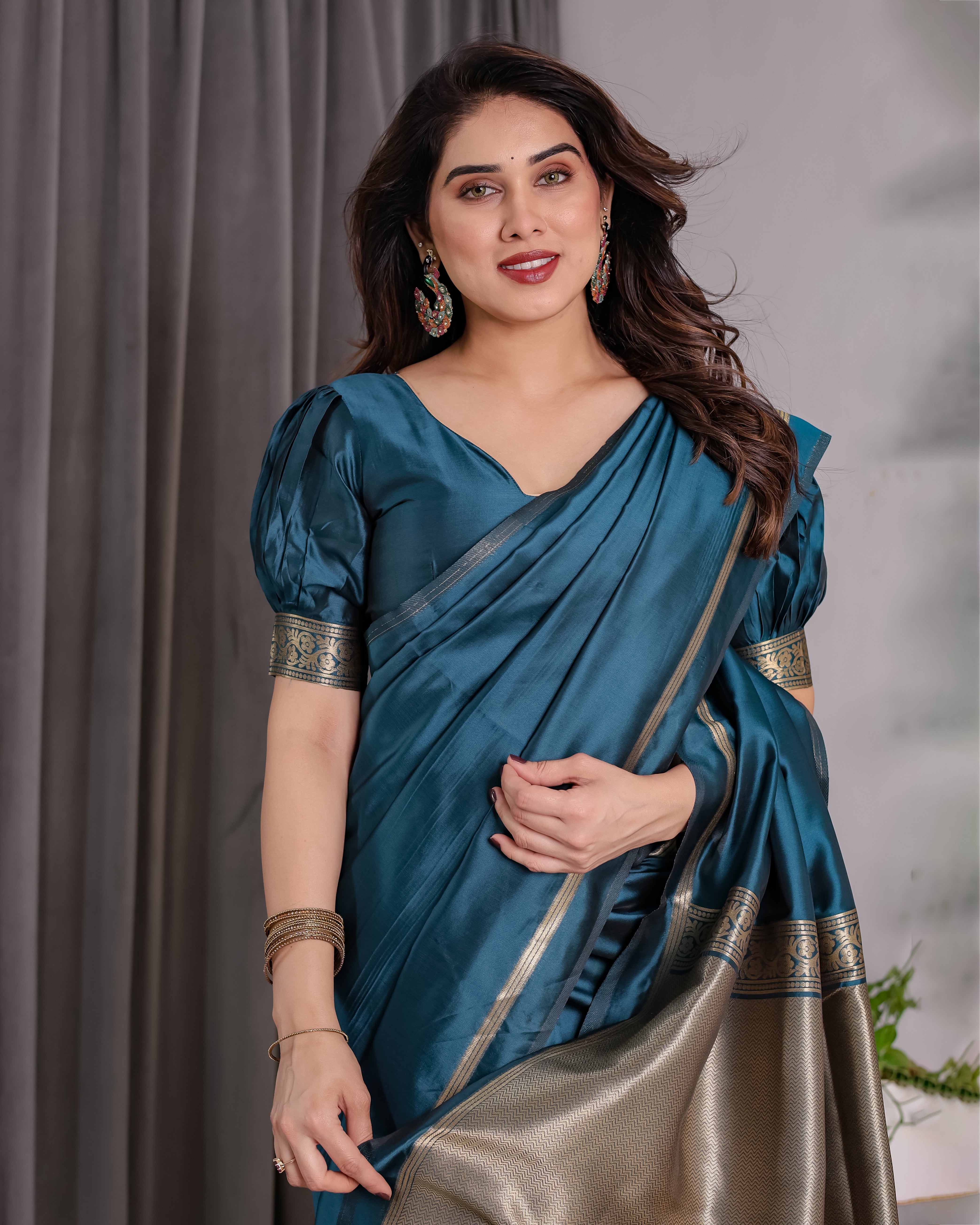 Whether it's a wedding event or a temple function, this saree offers grace, fluidity, and timeless appeal.