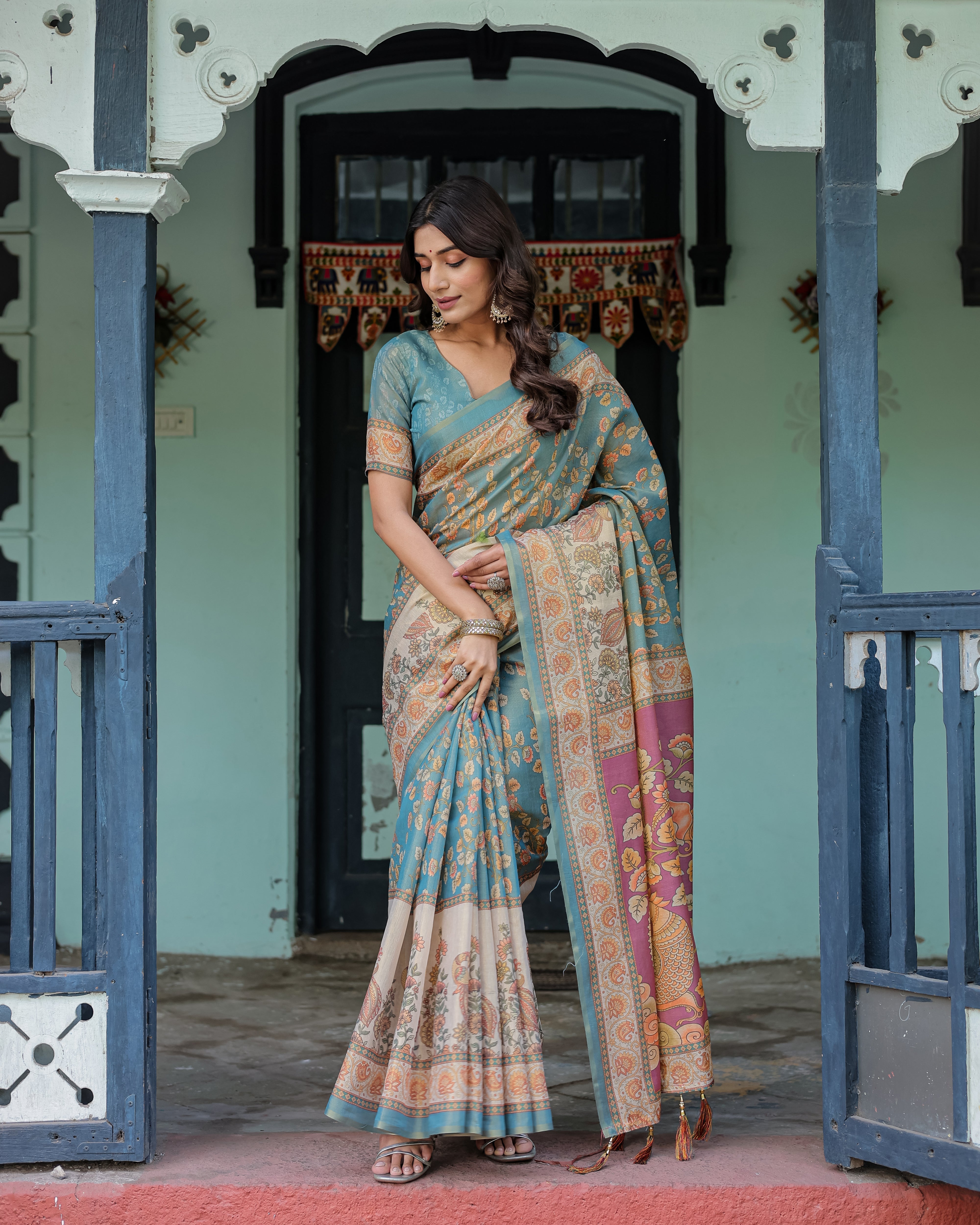 The pallu is a true work of art, richly illustrated in multicolor folk-inspired patterns, with delicate florals and paisleys painted in muted coral pink, soft lavender, ochre yellow, and sage green. A traditional peach-toned floral border with intricate detailing and a contrast selvedge frames the saree beautifully, adding depth and dimension to the drape.